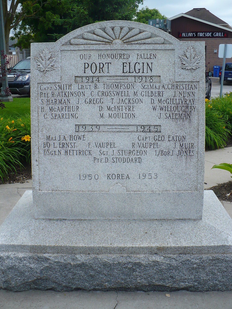 En 1924, les citoyens du canton de Saugeen et de Port Elgin érigèrent sur le site deux monuments commémoratifs correspondants pour rendre hommage à ceux périrent durant la Grande Guerre. En 1962, les pierres furent gravées à nouveau pour y ajouter les noms des personnes qui périrent durant la Seconde Guerre mondiale. D’autres gravures furent ajoutées en 1986 pour commémorer la guerre de Corée.