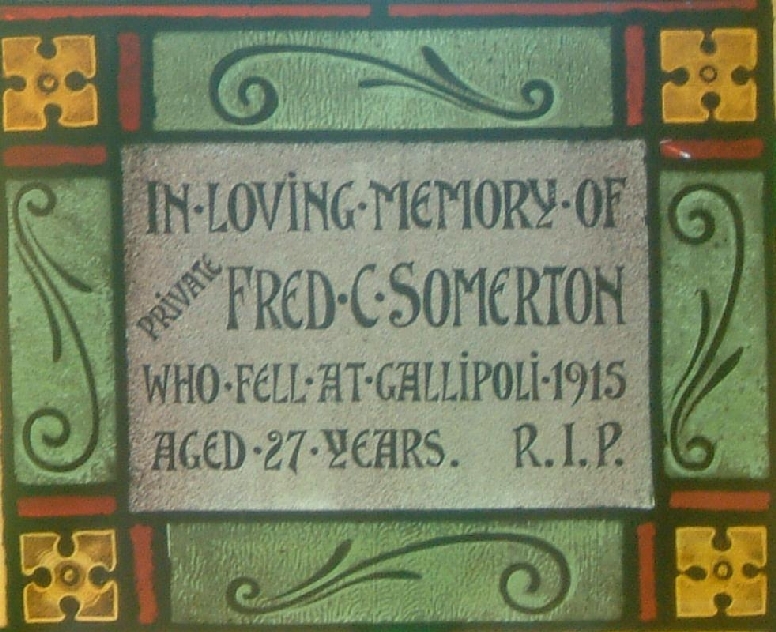 La fenêtre dédiée au soldat Frederick C. Somerton a été érigée en 1920. Celui-ci était membre du Royal Newfoundland Regiment et est mort le 25 novembre 1915, des suites de blessures subies à Gallipoli.