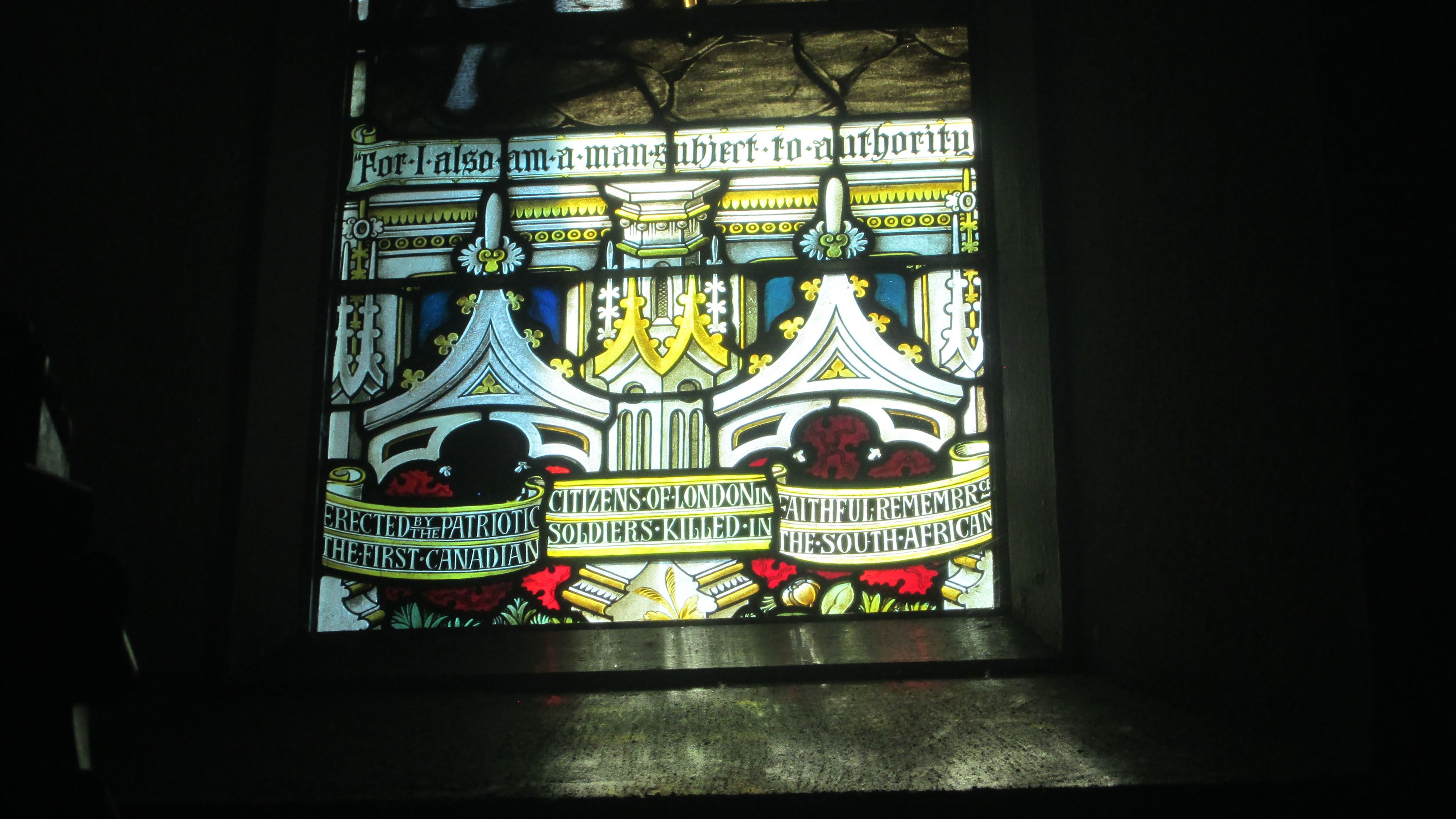 Ce vitrail est dédié à la mémoire du soldat John Andrew Donegan, un des premiers soldats à être tué durant la guerre d’Afrique du Sud.