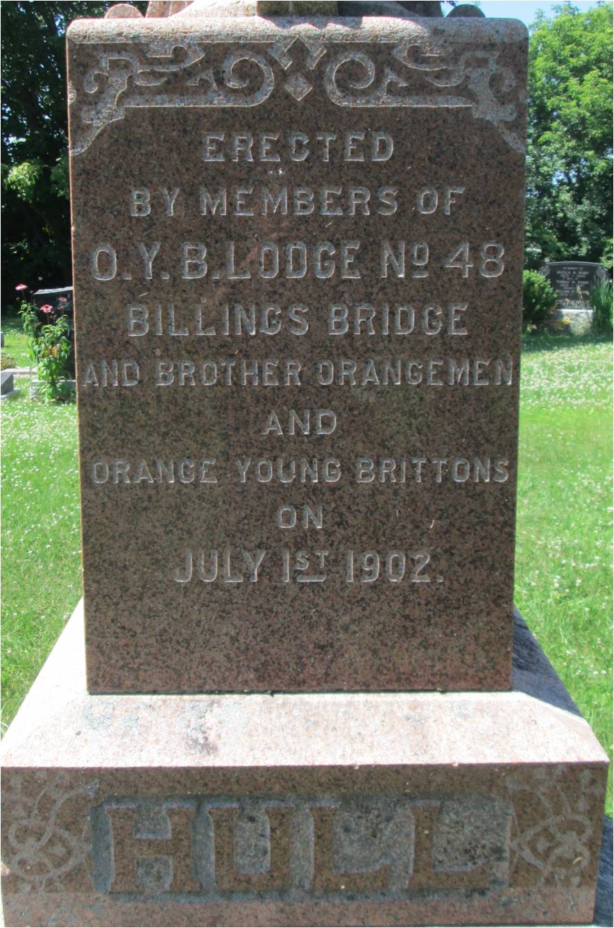 Ce monument était tout d’abord situé à côté du Orangemen’s Lodge au coin de la rue Bank et de la promenade Riverside, alors dans le village de Billings Bridge. En 1960, le monument a été déplacé pour permettre l’élargissement de la promenade Riverside et a été entreposé jusqu’en 1997. Après la signature de nombreuses pétitions par les membres du Orangemen’s Lodge, la Ville d’Ottawa a finalement procédé à une nouvelle inauguration du monument à son nouvel emplacement au cimetière anglican St. George’s, à Hawthorne, car beaucoup de membres de la famille Hull y sont enterrés.