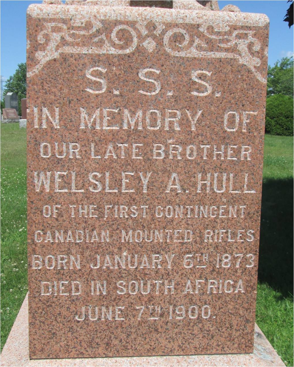 Ce monument commémoratif a été érigé à la mémoire du soldat Wellesley Alexander Hull. Il faut préciser que le nom de Wellesley Alexander Hull est épelé de différentes façons dans divers documents, soit « Wellesley », « Welsley » ou « Wesley ».