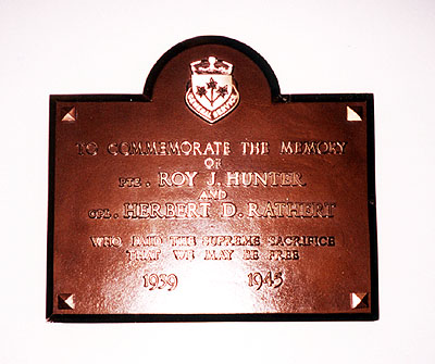 Cette plaque posée en 1947 est dédiée au soldat Roy J. Hunter et au caporal Herbert D. Rathert. Elle se trouve sur le mur de l’entrée du Brunkild Memorial Hall. En 1968, l’immeuble construit 21 ans auparavant à cet endroit a été détruit par un incendie, mais la plaque a résisté aux flammes et est maintenant montée dans le nouvel immeuble.