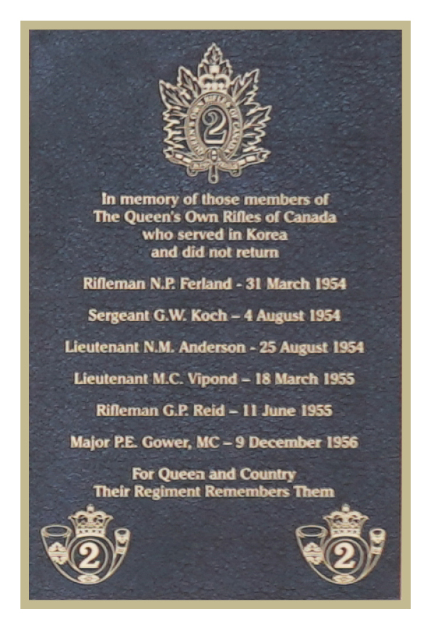 La plaque de la guerre de Corée rend hommage aux six membres du Queen’s Own Rifles of Canada qui ont perdu la vie en Corée. Elle a été dévoilée le 16 mai 2012.