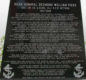 Ce mémorial fut dévoilé après 2005. Il est dédié au Contre-amiral Desmond William Piers DSC, CM, CD, D.SCMil, KLJ. R.C.N. (1913-2005).