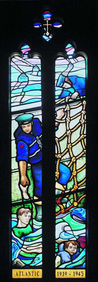 Three stained glass windows honouring all those who served in the Armed Forces during both World Wars.