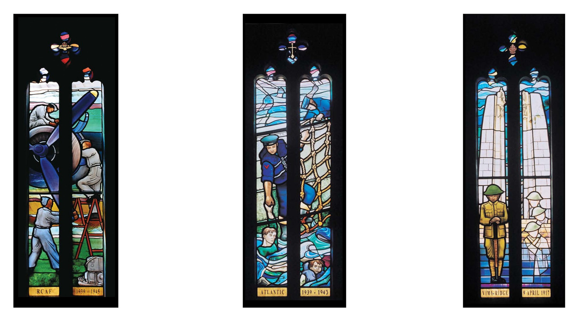 En tournant et en montant la volée suivante, on passe devant trois grands vitraux sur le mur sud, qui rendent hommage à tous ceux qui ont servi dans les forces armées au cours des deux guerres mondiales : l’armée de l’air, la marine et la crête de Vimy. En montant la troisième et dernière volée d’escaliers, deux petits vitraux se trouvent sur le mur nord : la marine marchande du Canada et les services auxiliaires de la Légion royale canadienne, la Croix-Rouge canadienne, les Chevaliers de Colomb, l’Armée du Salut et la Young Men’s Christian Association (YMCA).
