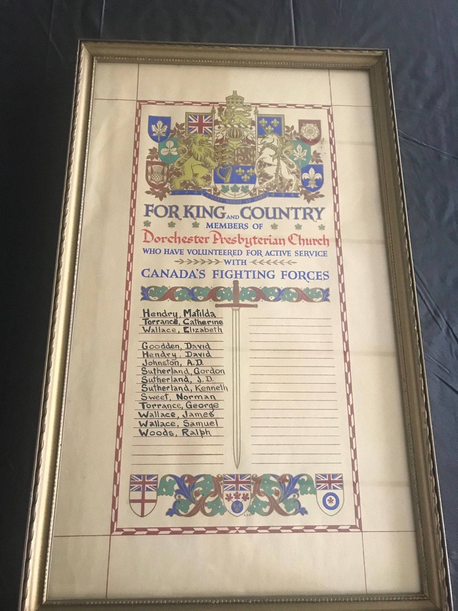 Ce Tableau d’honneur de la Seconde Guerre mondiale était situé juste à gauche du chœur dans l’église presbytérienne de Dorchester, au 1669, rue Richmond. L’église a été fermée et le Tableau d’honneur a été transféré à la filiale no 513 Donnybrook de la Légion royale canadienne.