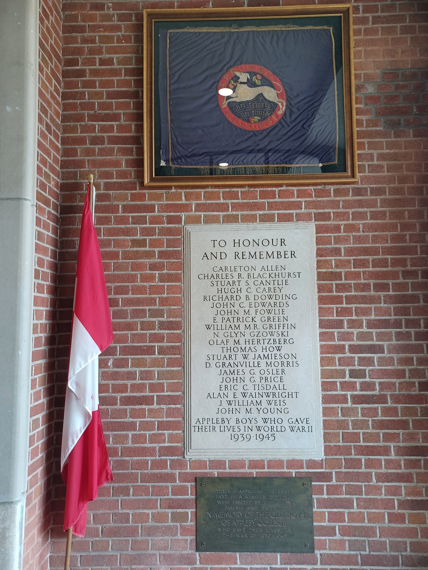 Le Tableau d’honneur de la Seconde Guerre mondiale, sur lequel sont gravés les noms des élèves du Collège Appleby décédés, a été ajouté à l’entrée commémorative en 1956.