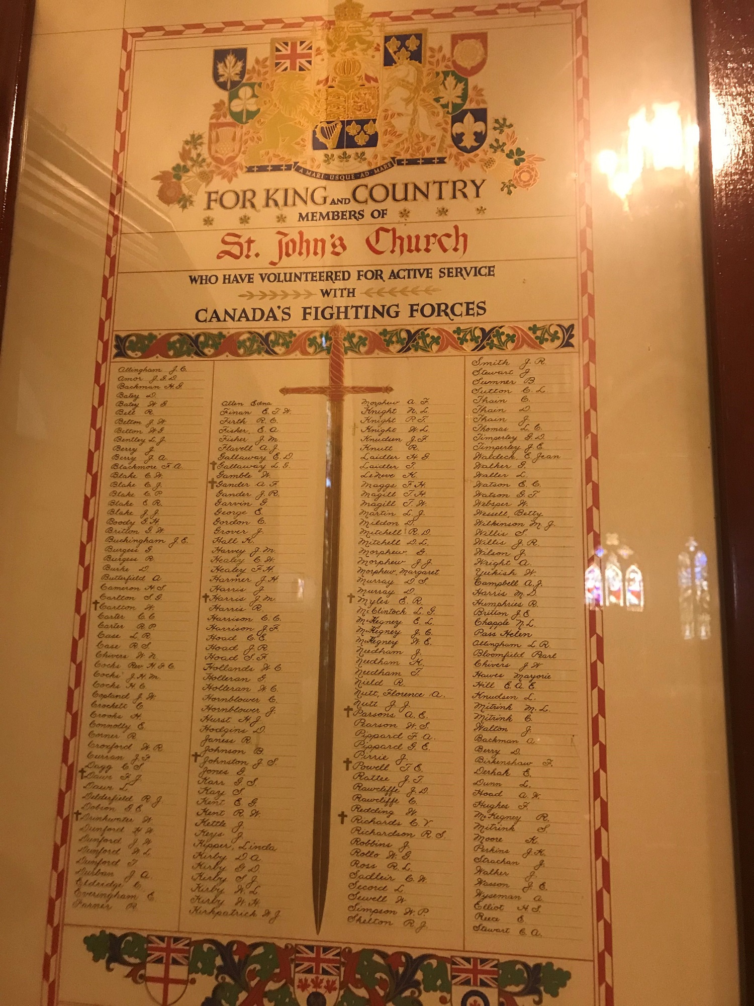 Le tableau d’honneur de l’église St. John’s pour la Seconde Guerre mondiale a été érigé à la mémoire des paroissiens qui ont servi pendant la Seconde Guerre mondiale. L’Église St. John’s a fusionné avec l’Église anglicane All Saints' en 2011.