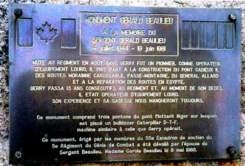 Ce monument, érigé par les membres du 55e Escadron de soutien du 5e Régiment du Génie de Combat a été dévoilé par l'épouse du Sergent Beaulieu, Madame Carole Beaulieu, le 8 mai 1988.