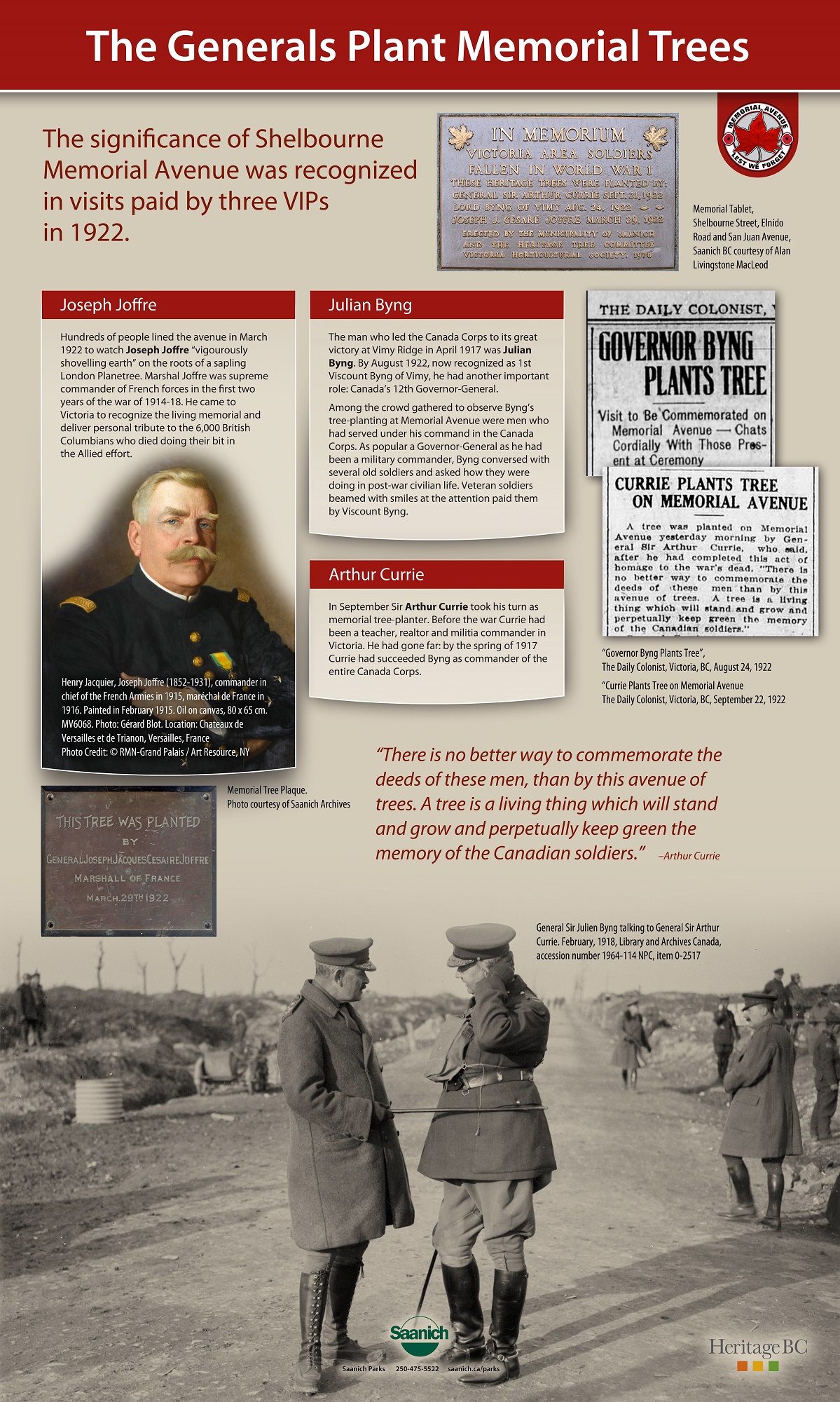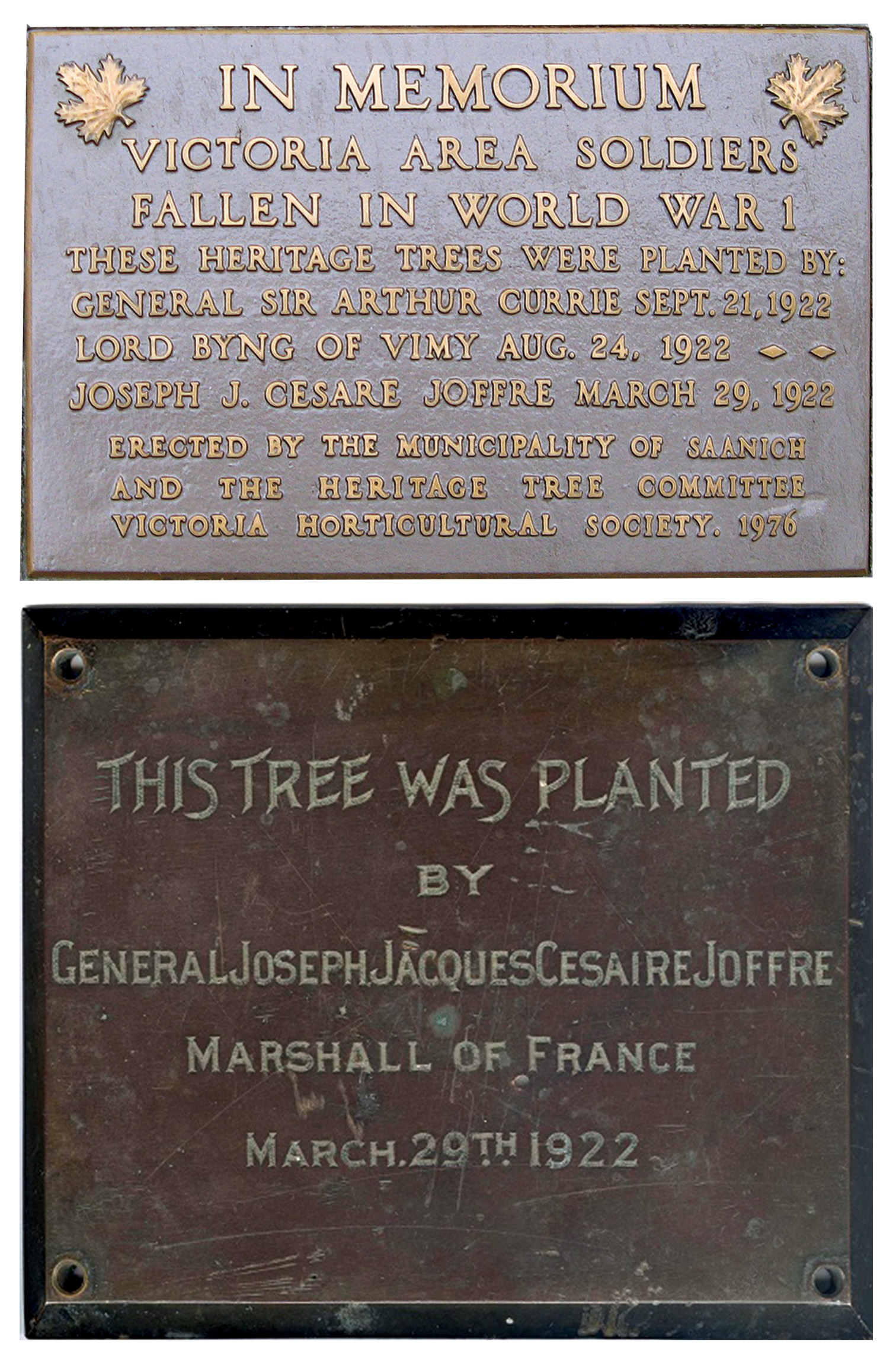 Hundreds of people lined the avenue in March 1922 to watch Joseph Joffre "vigourously shovelling earth" on the roots of a sapling London Planetree. Marshal Joffre was supreme commander of French forces in the first two years of the war of 1914-18. He came to Victoria to recognize the living  memorial and deliver personal tribute to the 6,000 British Columbians who died doing their bit in the Allied effort.