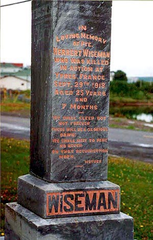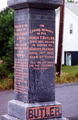 Ce mémorial, un socle en marbre surmonté d’une urne sculptée, a été érigé par les gens de Shoal Harbour en mémoire de Herbert Wiseman et James T. Butler, qui ont été tués durant la Première Guerre mondiale.
