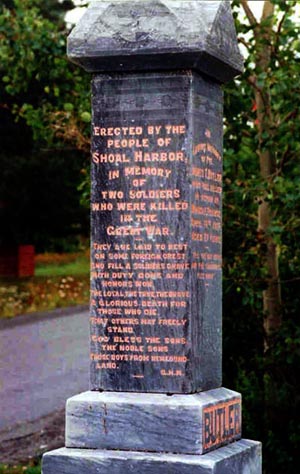 ERECTED BY THE PEOPLE OF SHOAL HARBOR, IN MEMORY OF TWO SOLDIERS WHO WERE KILLED IN THE GREAT WAR