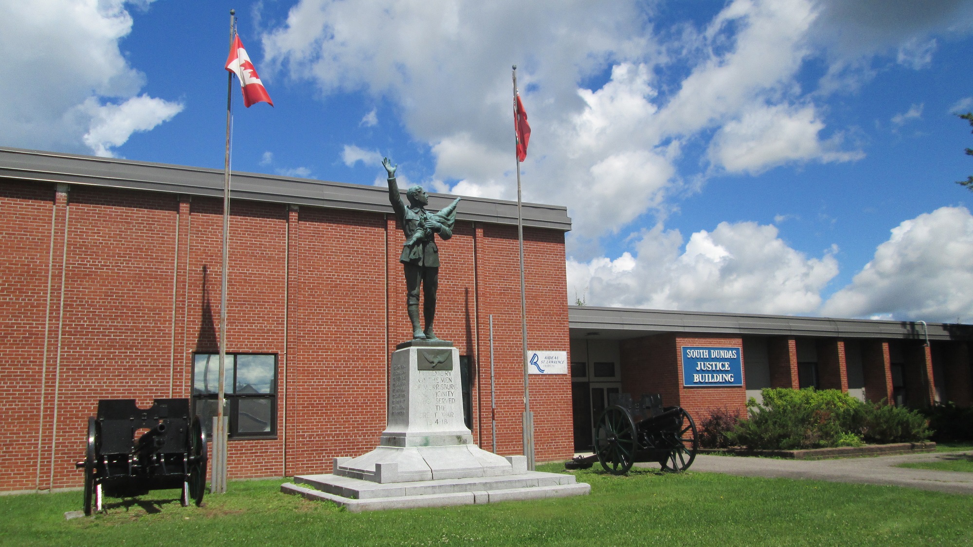 Plus de 5 000 personnes ont assisté, le 9 septembre 1923, à l’inauguration du monument aux morts érigé dans le parc municipal, à l’angle sud-est de la rue Main et de la route 31. Une rangée de majestueux peupliers de Lombardie, plantés par M. John H. Meikle, formaient un arrière-plan coloré pour la statue de bronze. Le mémorial a été déménagé par la suite devant l’édifice municipal de Morrisburg, rue Fifth.