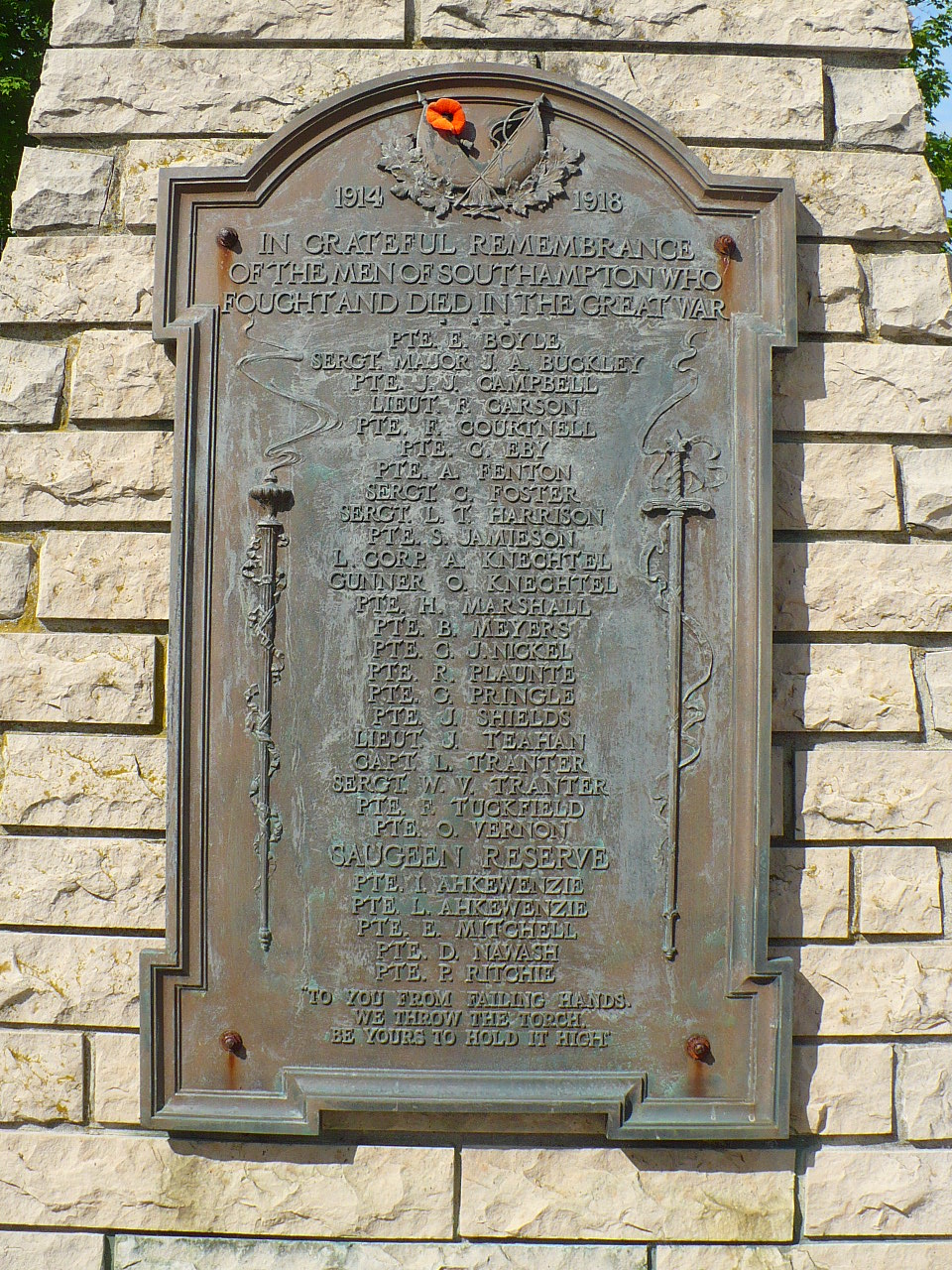 Le cénotaphe est constitué de deux plaques de bronze, une pour chacune des guerres mondiales, portant les noms des hommes de Southampton et de la Première Nation de Saugeen voisine qui ont donné leur vie. Les plaques de bronze ont été produites à North Bay chez Rhan Metals, une entreprise aujourd’hui devenue Rhan Plastics. La plaque de la Première Guerre mondiale se trouvait auparavant dans la tour de l’hôtel de ville, où elle avait été inaugurée avec l’horloge commémorative en 1922. Une grande croix a été ajoutée plus tard derrière le cénotaphe.