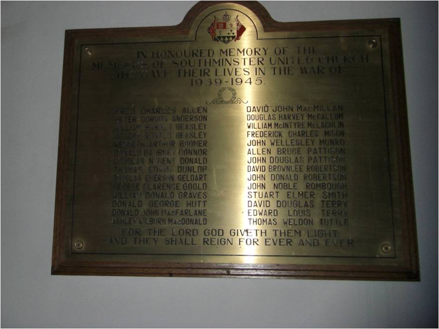 Ce mémorial honore la mémoire des membres de la Southminster United Church qui ont donné leur vie pendant la Seconde Guerre mondiale.
