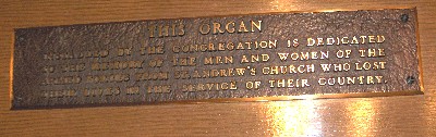 Don de la congrégation de St.Andrew’s ce grand orgue est dédié aux hommes et aux femmes militaires de la paroisse morts en service.