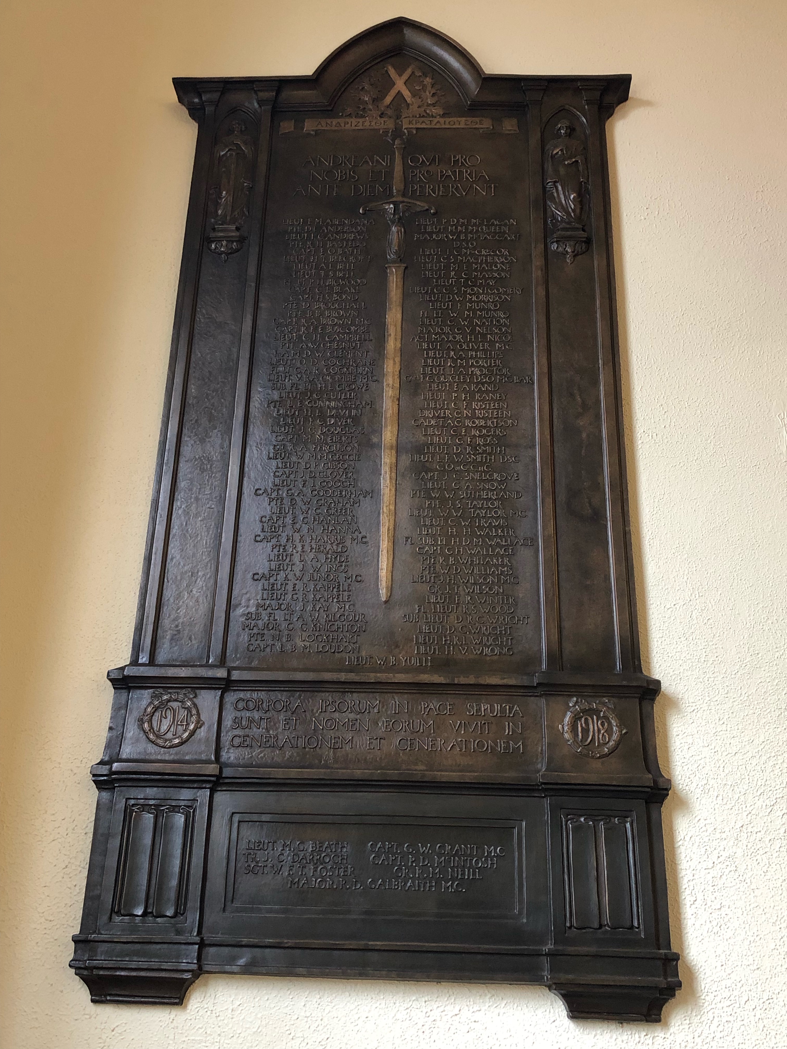 At the back of the Chapel are flags representing the various countries from which Andreans have come from over the years. In the corner is the flag of the #142 St. Andrew’s College Highland Cadet Corps. Throughout the Chapel are plaques memorializing people who have contributed significantly to the Andrean community, along with memorabilia from the First World War.