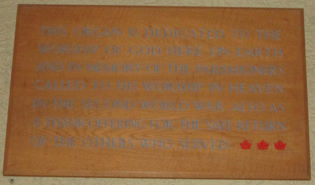 This organ is dedicated to the worship of God here on earth and in memory of the parishioners called to His worship in heaven in the Second World War also as a thank offering for the safe return of the others who served.
