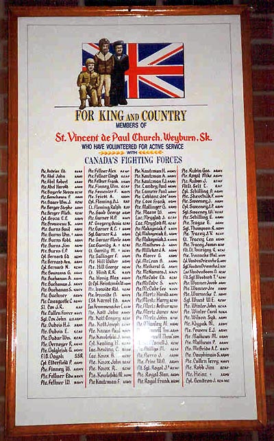 Ce tableau d'honneur porte les noms de tous les membres de la congrégation de l'Église St. Vincent de Paul qui ont combattu dans les forces canadiennes pendant la Seconde Guerre mondiale.