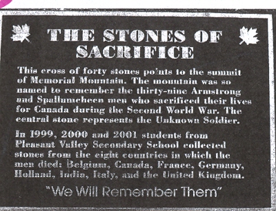 Ce monument a été réalisé en 2001 et inauguré le 6 juin de la même année. Pendant trois ans, de 1999 à 2001, les élèves de l’école secondaire de Pleasant Valley ont collectionné des pierres des huit pays dans lesquels des hommes d’Armstrong/Spallumcheen ont perdu la vie pendant la Seconde Guerre mondiale. Ces pierres ont été disposées pour former une croix pointant vers le mont Memorial, ainsi nommé en l’honneur des 39 hommes de la région qui ont perdu la vie pendant ce conflit. Les élèves qui ont aidé à construire ce mémorial se disaient qu’eux savaient qui ces pierres représentaient, mais que les visiteurs ne le sauraient pas. Il fallait donc une plaque d’interprétation pour montrer aux familles quelle pierre représentait leur cher disparu. Cette plaque a été conçue et réalisée par un autre groupe de diplômés de l’école secondaire Pleasant Valley et inaugurée le 6 juin 2004. Ont contribué au mémorial: Richard Lonsdale, Tom Sidney, James Wood, Keith Worden, John Irving, Jim Howe, Wayne Kyle, Larry Hopner, Mat Hassen, Vic Polichek, Pierre Vaudry, du magasin UPS Groupes, lycéens de l’école secondaire Pleasant Valley 1999-2004, Commission des parcs et des loisirs d’Armstrong & Spalumcheen, Associated Ready Mix, Budget Trophies, Greenscape Landscaping, Meggalt Trucking, Nor Val Rentals, Otter Lake Sand and Gravel, Shepherds Home Hardware, Vernon Paving, Wood-N-Chick Furniture, et Noble Tractor & Equipment Ltd.