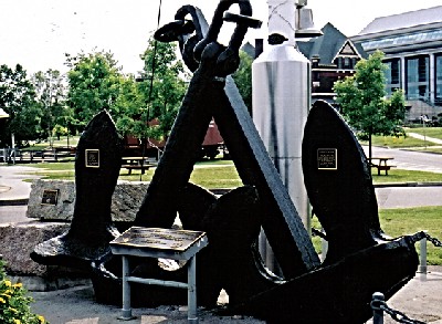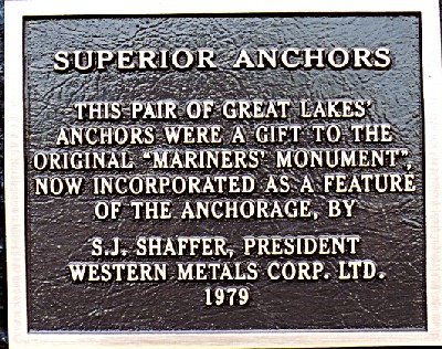 Cloche du Mémorial d’Anchorage, Caronades, Hommage au navires, Ancre du S.S. Rappahannock, Plaques du Monument aux marins, et Plaques aux marins de Thunder Bay.