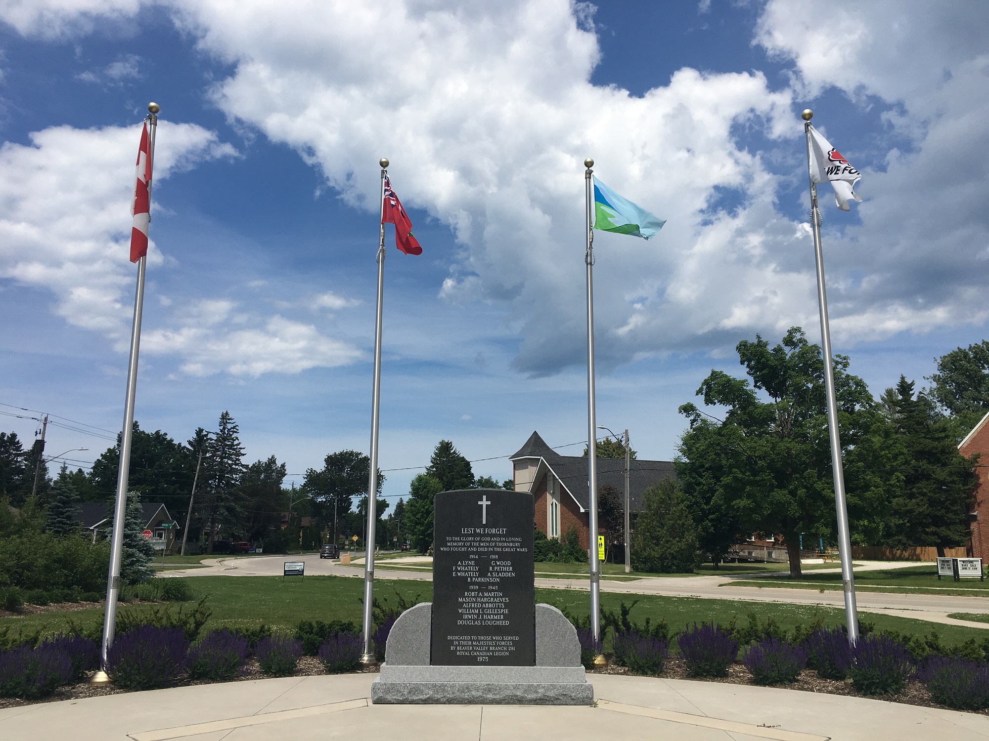 The Thornbury Cenotaph was erected in 1975 at Jack Acres Memorial Park on Russell Street, by the Royal Canadian Legion Beaver Valley Branch 281 to honour those from the area who died in the two World Wars. On 1 November 2019, it was relocated to its current location and re-dedicated on 7 June 2020.