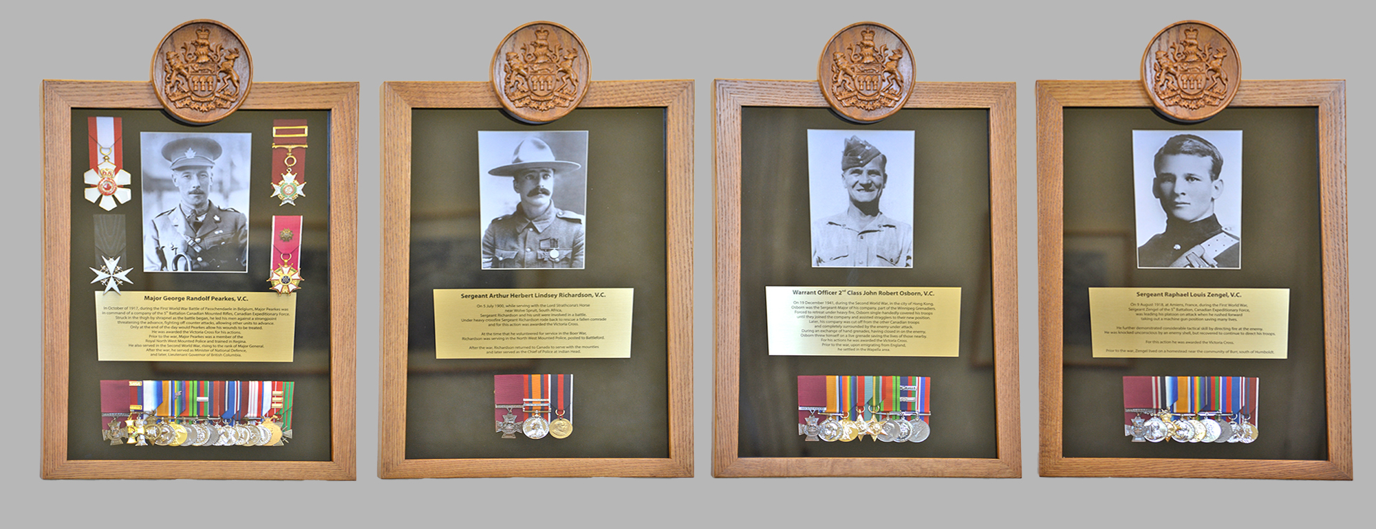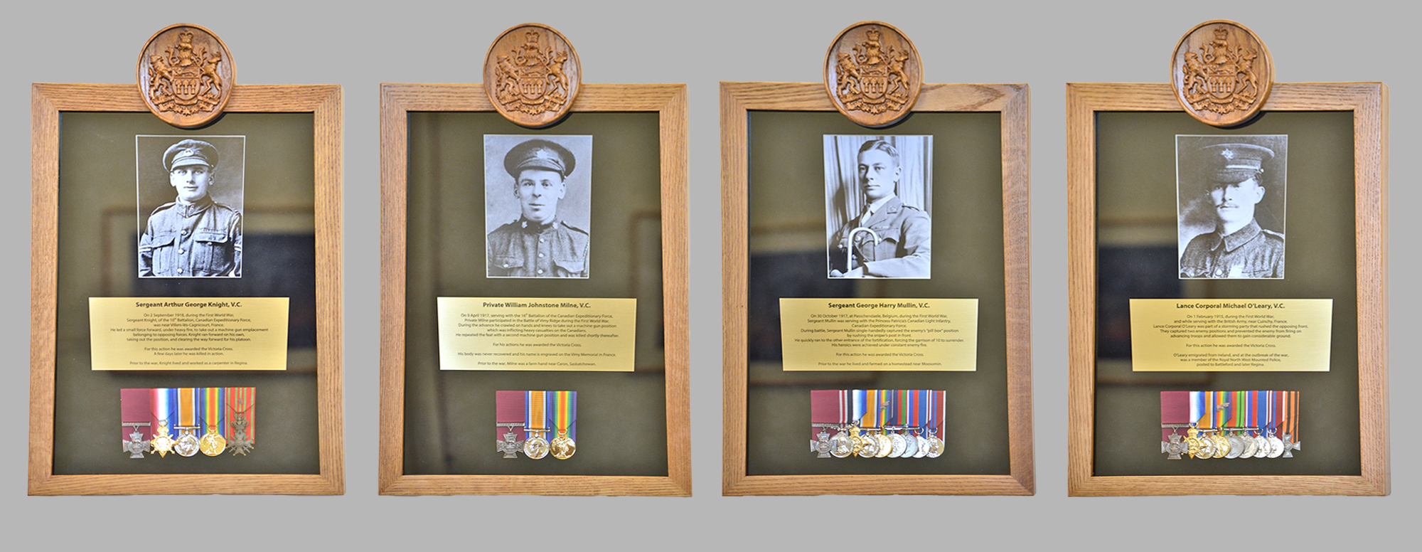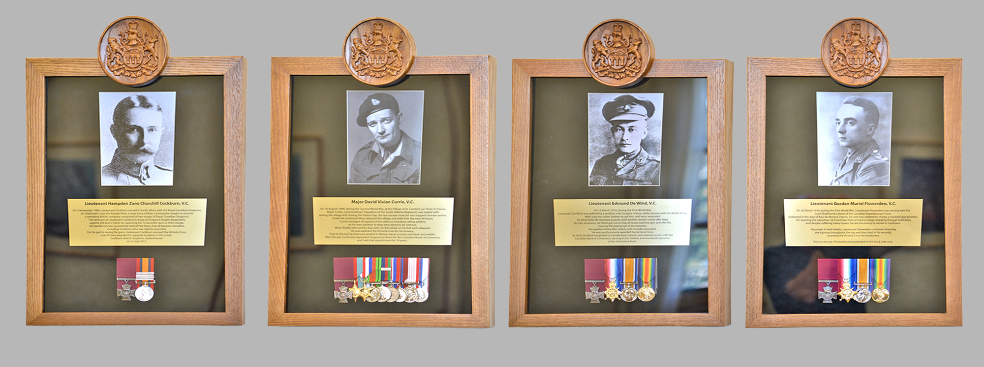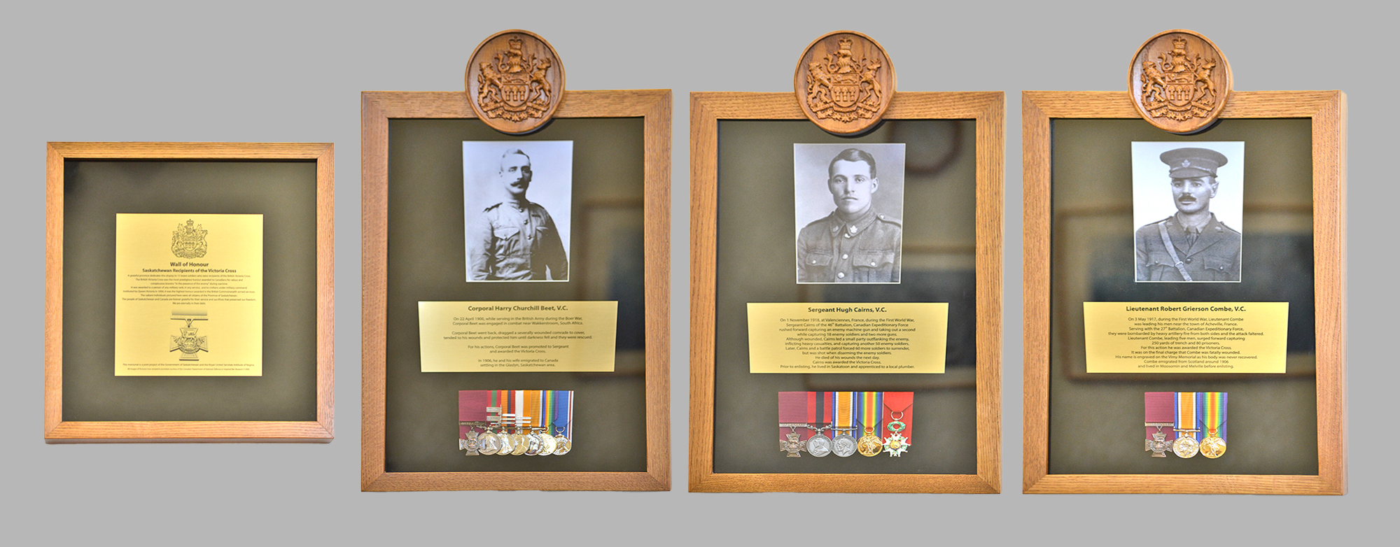 Les 15 récipiendaires de la Croix de Victoria sur le Mur d’honneur vivaient en Saskatchewan à un moment donné. Les boîtes-cadres ont été dévoilées sur un montage temporaire lors d’une cérémonie dans l’édifice de l’Assemblée législative le 7 novembre 2018, puis déplacées dans la salle 218.