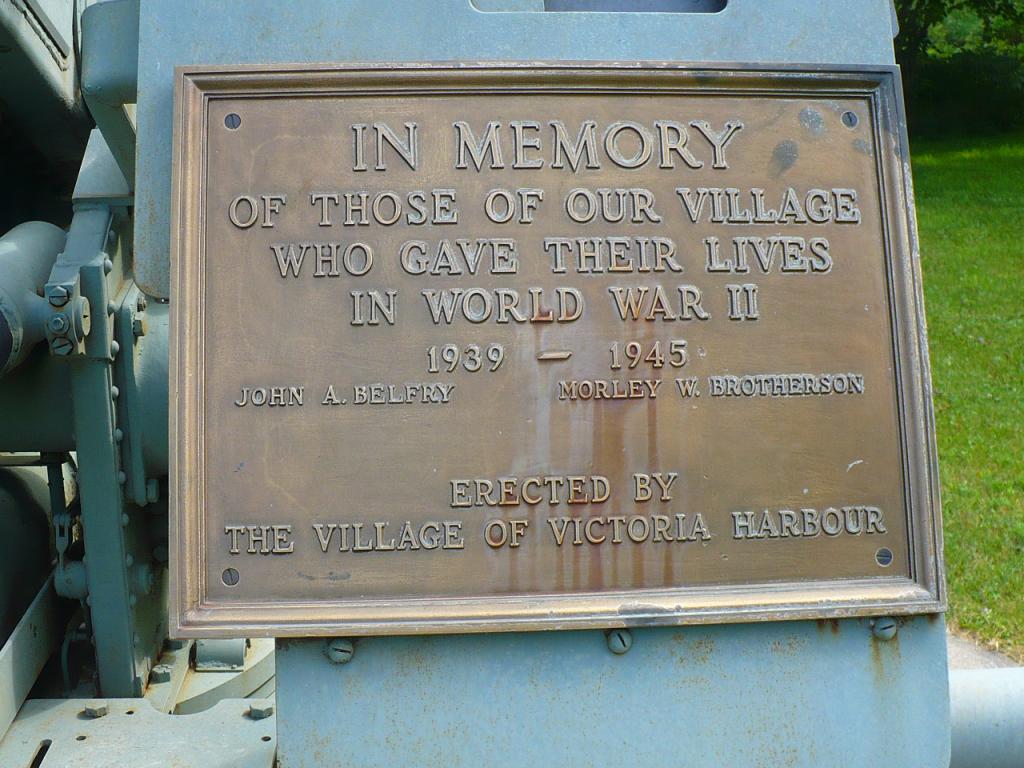 Ce mémorial est dédié aux résidents de Victoria Harbour qui ont servit pour leur pays. Le mur de pierre doté d’une grosse croix blanche fut érigé en 1967 par la filiale no 523 de la Légion royale canadienne. Un canon antiaérien commémoratif avec deux plaques sur lesquelles on retrouve les listes de noms des soldats de Victoria Harbour morts pendant les deux Guerres mondiales, se trouve à proximité.