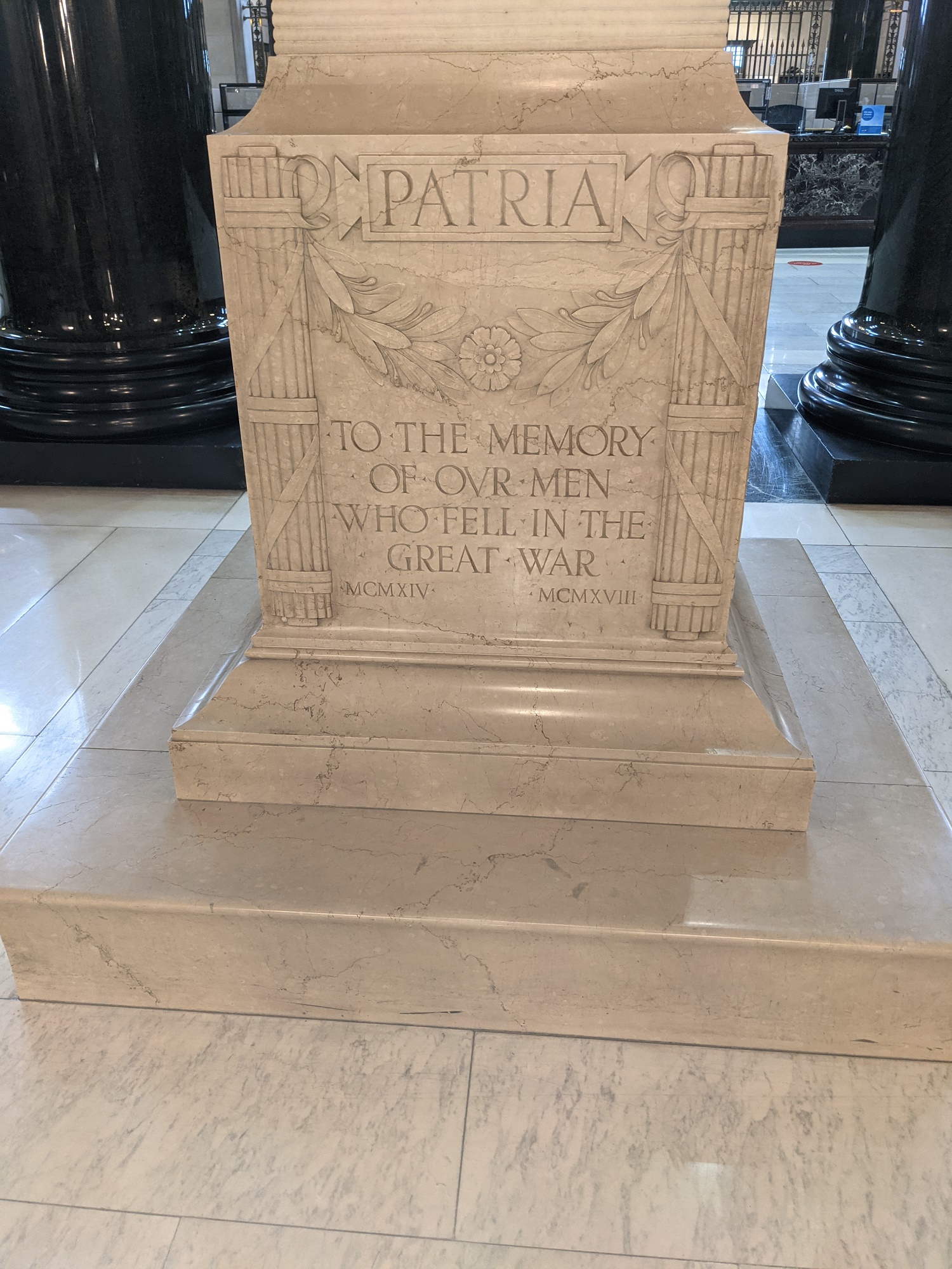 La plaque commémorative de la Première Guerre mondiale et la plaque commémorative de la Seconde Guerre mondiale sont situées sur le mur est de l’atrium. Le tableau d’honneur de la Première Guerre mondiale de la Molson’s Bank et le tableau d’honneur de la Merchants Bank of Canada sont situés sur le mur sud du comptoir bancaire, juste après l’atrium.