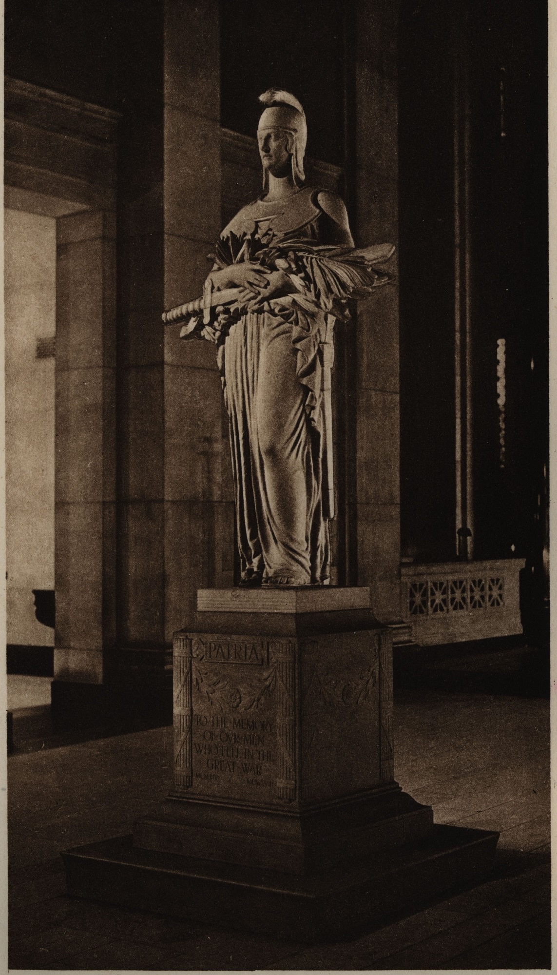 La figure allégorique de la Victoire est emblématique non pas de la mort, mais de la victoire. Elle se tient debout, les bras croisés sur une épée couverte de feuilles de palmier. La figure mesure neuf pieds de haut, est sculptée en marbre blanc de Serezza et repose sur un piédestal en marbre Botticinio de huit pieds de haut. La base du piédestal est décorée sur les quatre côtés de faisceaux en très bas relief, entre lesquels pendent des festons de laurier. La Victoire se tient les bras croisés sur une épée couverte de feuilles de palmier qui, avec les draperies, le corselet et le casque, forment une unité impressionnante. Le personnage a un visage d’une sérénité inébranlable, réchauffé par une touche de sympathie humaine qui transmet de manière subtile l’idée de triomphe à travers la souffrance et le sacrifice. Le célèbre sculpteur américain James Earle Fraser s’est inspiré du hall d’entrée de la banque avec ses majestueuses colonnes de granit foncé. La sculpture a été érigée en décembre 1923.