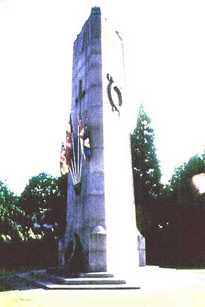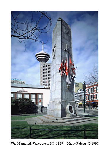 Cet obélisque de granit gris, haut de trente pieds au bas d’une colline dans le Square Victory, est situé près d'un acre de gazon vert entouré d’arbustes et de fleurs. Par sa situation dans le square très fréquente et sa forme en clef, il a été surnommé le "Keystone of Vancouver". Le cénotaphe a été érigé en 1924 grâce aux dons du public et est fait de granit provenant de l’île Nelson. Il y a des inscriptions et se trouve constamment décoré de couronnes de fleurs et de drapeaux. Le major G.L. Thornton Sharp, architecte, planificateur urbain et commissaire du parc, a conçu le design à trois faces. Le granit provient de la Vancouver Granite Co.,Ltd., et la construction est de messieurs Stewart et Wylie; M. Stewart est décédé des suites d’un accident lors de la construction du mémorial. Les parrains du projet, membres du Vancouver War Memorial Committee, étaient au nombre de 24, 12 d'entre eux représentent le Canadian Club of Vancouver et 12 le Civic War Memorial Committee, la présidence relevait de F.W. Rounsefell, pionnier et J.R.V. Dunlop du Canadian Club l'assistait à titre de secrétaire honoraire. Le coût du cénotaphe a été de 10,666$. Le cénotaphe a été dévoilé le dimanche, 27 avril 1924, par monsieur W.R. Owen, maire de Vancouver, devant une foule de 25,000 personnes, militaires et civils des Old Contemptibles, 7th British Columbia, 29th Vancouver, 72nd Seaforth, 2nd Canadian Mounted Rifles, 47th Westminster et 102nd North British Columbia Battalions, C.E.F. La cérémonie a été célébrée par le major, rev. Cecil C. Owen, MBE, VD, DD, aumônier du 29th (Vancouver) Battalion, C.E.F. Ref.: J.S. Mathews, Archives, Hôtel de ville, Vancouver, 1944.