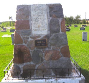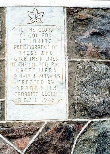 Ce mémorial, érigé en 1948 par la filiale no 113 de la Légion royale canadienne (alors connue sous le nom de British Empire Service League), est dédié aux morts de la Première et de la Seconde Guerres mondiales. Une plaque de bronze a été ajoutée en 2000 pour commémorer la guerre de Corée. La société Leroy Masonry, de Virden (Manitoba), a également changé le coulis de ciment à ce moment là. Le mémorial a été inauguré le 26 septembre 1948 à deux heures de l’après-midi. La cérémonie s’est déroulée comme suit : Tout a commencé par l’hymne national. Le président, le camarade A.L. Dennis, a présenté le conférencier invité, le député fédéral E. McCullogh. Le révérend père Wm. Cross a récité la prière de dédicace, et le camarade C.A. Rolfe a lu les noms des combattants disparus. Deux hymnes ont ensuite été chantés, « Onward Christian Soldiers » et « Abide with Me ». La prière a été récitée par le camarade révérend R.F. Wheeler. Le révérend W. Groom a lu un passage des Écritures. Il y avait également une garde d’honneur dirigée par Wm. Kenney. La sonnerie aux morts a été interprétée, et il y a eu deux minutes de silence. Des couronnes ont ensuite été déposées, après quoi la cérémonie s’est terminée par une bénédiction et le « God Save the King ». La musique, pour la cérémonie, était interprétée par la musique de la Légion royale canadienne de Moosomin.