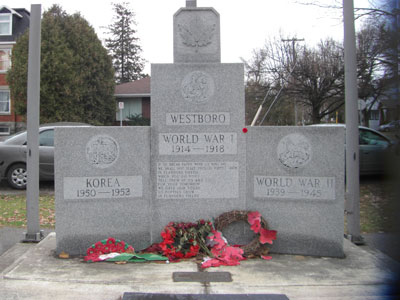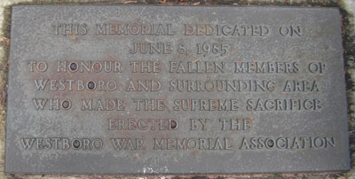 Le Monument commémoratif de guerre de Westboro a été dévoilé le 8 juin 1985 par la Westboro War Memorial Association. La Mère de la Croix d’argent, Alice Taylor, ancienne résidente de longue date de Westboro et vétérane de la Première Guerre mondiale, a présidé au dévoilement officiel. Charley Timms a installé une capsule temporelle à la base du monument. La capsule contient un rouleau avec les noms de 396 hommes et femmes de l’ancien village de Westboro qui ont été tués pendant la Première Guerre mondiale, la Seconde Guerre mondiale et la guerre de Corée.