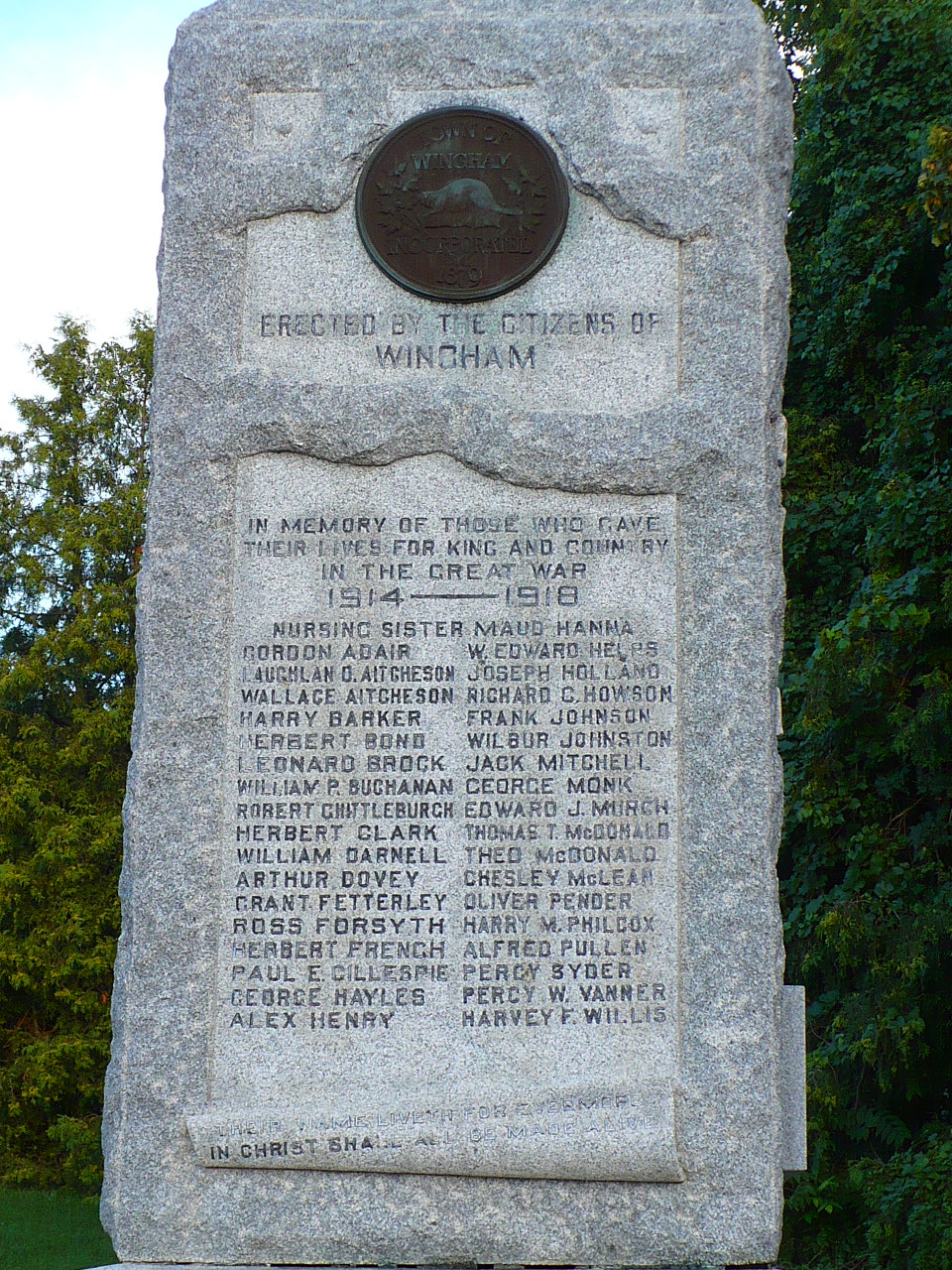 Première Guerre mondiale Maud Hanna - Sœur infirmière, SSAC, décédée le 6 septembre 1921 après une longue maladie, inhumée au cimetière de Wingham. Gordan Adair - 161e bn (Huron), décédé accidentellement en Angleterre le 22 novembre 1917, inhumé au cimetière militaire Hants 2, cimetière paroissial de Bramshott (St. Mary). Laughlan Aitchison - 1er bon, 1re bde, 1re division canadienne, Corps expéditionnaire canadien, décédé des suites de blessures le 10 juillet 1915, inhumé au cimetière St. Lawrence, Ramsgate, Angleterre. Wallace Aitchison - 38e bon, 4e bde, 4e division canadienne, Corps expéditionnaire canadien, décédé des suites de blessures le 11 avril 1917, inhumé au cimetière militaire de Bruay, France. Frère de Laughlan Aitchison. Harry Barker - 58e bon, 9e bde, 3e division canadienne, Corps expéditionnaire canadien, tué au combat le 26 octobre 1917, inscrit au Mémorial de la Porte de Menin, Ypres, Belgique. Herbert Bond - 5e bon canadien de fusiliers à cheval, 8e bde, 3e division canadienne, Corps expéditionnaire canadien, décédé des suites de blessures le 6 novembre 1918, inhumé au cimetière britannique d’Auberchicourt, France. Leonard Brock - 50e bon (régiment de l’Alberta), 10e bde, 4e division canadienne, Corps expéditionnaire canadien, tué au combat le 9 juin 1916, inhumé au cimetière militaire d’Adanac, Miraumont-Pys, France. William Buchanan - 75e bon, 11e bde, 4e division canadienne, Corps expéditionnaire canadien, tué au combat le 8 juin 1917, inhumé au Monument commémoratif de Vimy, France. Robert Chettleburg - 1er bon, 1re bde, 1re division canadienne, Corps expéditionnaire canadien, décédé des suites de blessures le 6 octobre 1918, inhumé au cimetière militaire de Terlincthun, France. Herbert Clark - 47e bon (Western Ontario Regiment), 4e division canadienne, Corps expéditionnaire canadien, tué au combat le 2 septembre 1918, inhumé au Monument commémoratif de Vimy, France. William Darnell - 4e bon (Central Ontario), 1re bde, 1re division canadienne, Corps expéditionnaire canadien, tué au combat le 29 décembre 1915, inhumé au cimetière militaire de Saint-Quentin Cabaret, Belgique. Arthur Dovey - 1er bon Essex Regiment, 37e division, Armée britannique, tué au combat le 1er février 1918, inhumé au cimetière d’Oxford Road, Belgique. Grant Fetterlet - 18e bon, 4e bde, 2e division canadienne, Corps expéditionnaire canadien, décédé en Angleterre le 19 février 1919, inhumé au cimetière paroissial de Bramshott (St. Mary), Hampshire, Angleterre. Ross Forsyth - 58e bon, 9e bde, 3e division canadienne, Corps expéditionnaire canadien, décédé des suites de blessures le 6 juin 1917, inhumé au cimetière militaire d’Etaples, France. Herbert French - 1er bon, 1re bde, 1re division canadienne, Corps expéditionnaire canadien, décédé en Angleterre le 24 décembre 1914, inhumé au cimetière de l’église de Bulford, Angleterre. Paul Gillespie - 9e ambulance canadienne de campagne, SSAC, tué au combat le 7 septembre 1918, inhumé au cimetière du Fauboug d'Amiens, Arras, France. George Hayles - 58e bon, 9e bde, 3e division canadienne, Corps expéditionnaire canadien, décédé des suites de blessures le 26 juin 1917, inhumé au cimetière militaire de Lapugnoy, France. Alex Henry - 1er bon, 1re bde, 1re division canadienne, Corps expéditionnaire canadien, tué au combat le 6 novembre 1917, inscrit au registre du Mémorial de la Porte de Menin, Ypres, contenant les noms des militaires tombés dans les Flandres et sans sépulture connue. Edward Helps - 18e bon, 4e bde, 2e division canadienne, Corps expéditionnaire canadien, tué au combat le 13 mars 1917, sans sépulture connue. Joseph Holland - 1er bon, 1re bde, 1re division canadienne, Corps expéditionnaire canadien, tué au combat le 3 septembre 1916, inhumé au Monument commémoratif de Vimy, France. Richard Howson - 116e bon, 3e division canadienne, Corps expéditionnaire canadien, tué au combat le 22 août 1917, inhumé au cimetière du Commonwealth d’Aix-Noulette, France. Frank Johnson - 47e bon, 4e division canadienne, Corps expéditionnaire canadien, tué au combat le 10 août 1918, inhumé au CHYD.EXT de Warvillers, France. Wilbur Johnson - 2e brigade, Artillerie canadienne de campagne, 1re division canadienne, Corps expéditionnaire canadien, décédé en Angleterre le 29 janvier 1918, inhumé au cimetière de Bath (Locksbrook), Somerset, Angleterre. Jack Mitchell - 46e bon, 10e bde, 4e division canadienne, Corps expéditionnaire canadien, décédé dans un accident d’avion en Angleterre le 24 janvier 1919, inhumé au cimetière paroissial de Throwley (St. Michaels), Kent, Angleterre. George Monk - The Royal Canadian Regiment, 3e division canadienne, Corps expéditionnaire canadien, tué au combat le 9 avril 1917, inhumé au Monument commémoratif de Vimy, France. Edward Murch - 1er bon, 1re bde, 1re division canadienne, Corps expéditionnaire canadien, décédé des suites de blessures le 28 avril 1917, Boulogne, France. Thomas McDonald - 58e bon, 3e division canadienne, Corps expéditionnaire canadien, tué au combat le 13 novembre 1917, inscrit au Mémorial de la Porte de Menin, Ypres, Belgique. Theo McDonald - 58e bon, 3e division canadienne, Corps expéditionnaire canadien, tué au combat le 15 juin 1917, inhumé au cimetière britannique de Vimy, France. Chesley McLean - Royal Flying Corps (prédécesseur de la R.A.F.), décédé à l’entraînement en Angleterre le 16 août 1918, son avion s’étant écrasé en mer du Nord; son nom est inscrit au mémorial du cimetière de Hollybrook, Southampton, Angleterre. Oliver Pender - 5e batterie de siège canadienne, 2e bde, Artillerie de garnison canadienne comme troupe de corps, décédé des suites de blessures le 21 avril 1917, inhumé au cimetière de Villers Station, France. Harry Philcox - 1er bon, 1re division canadienne, Corps expéditionnaire canadien, décédé des suit