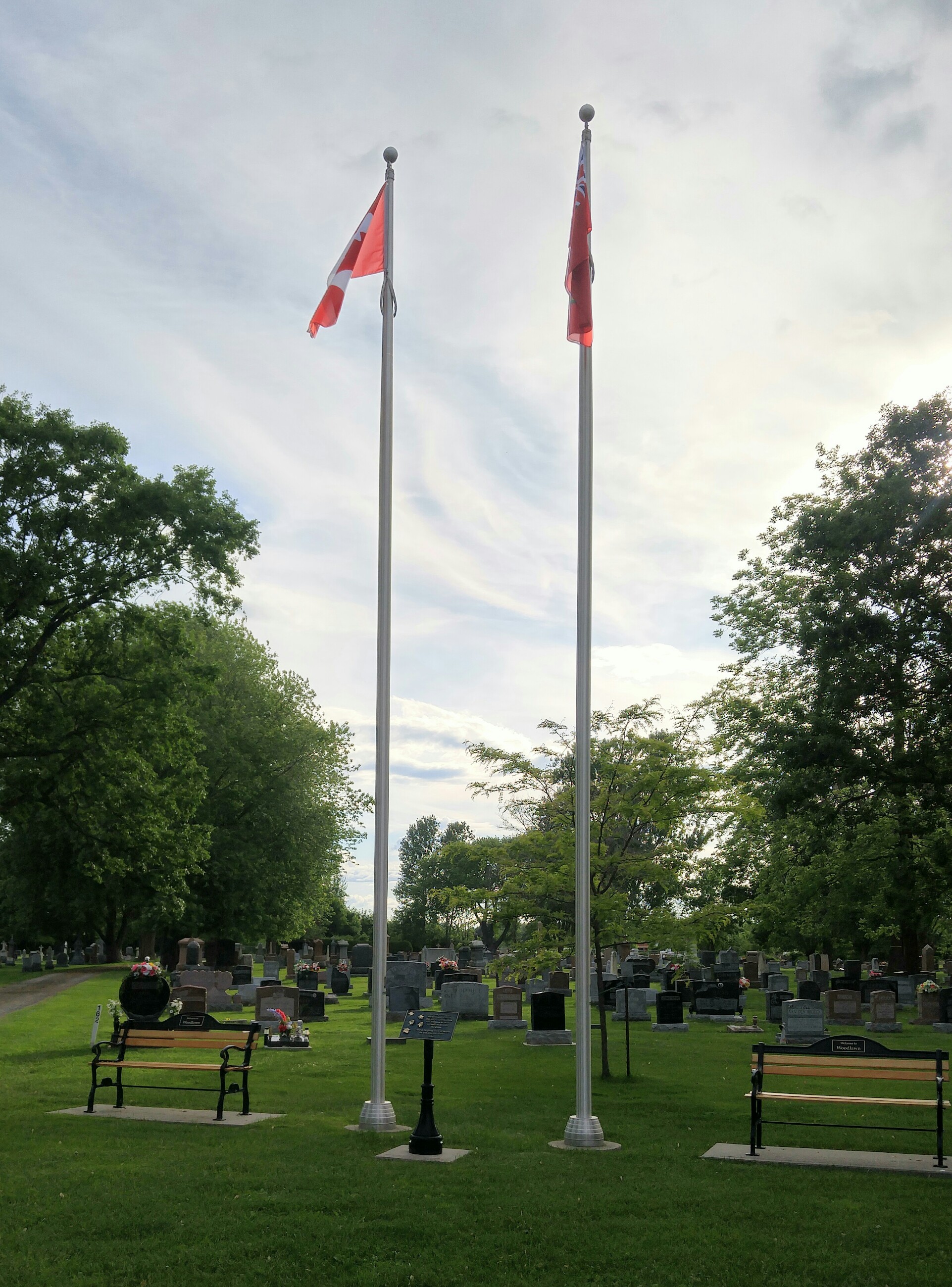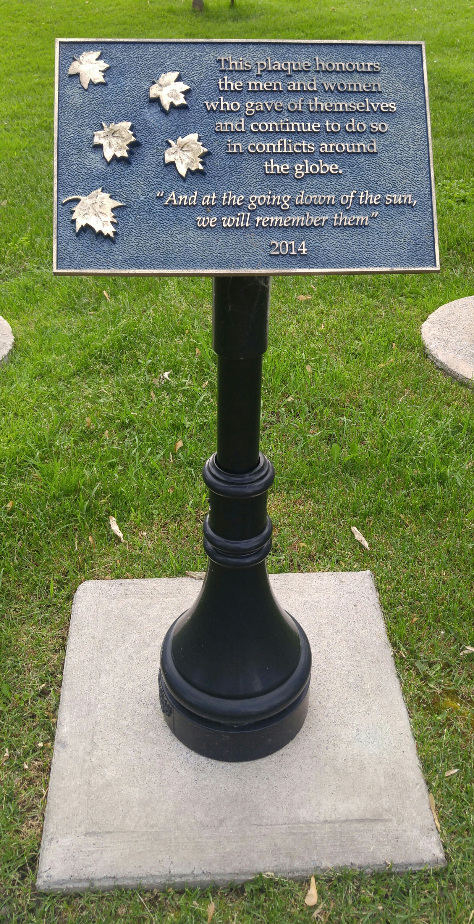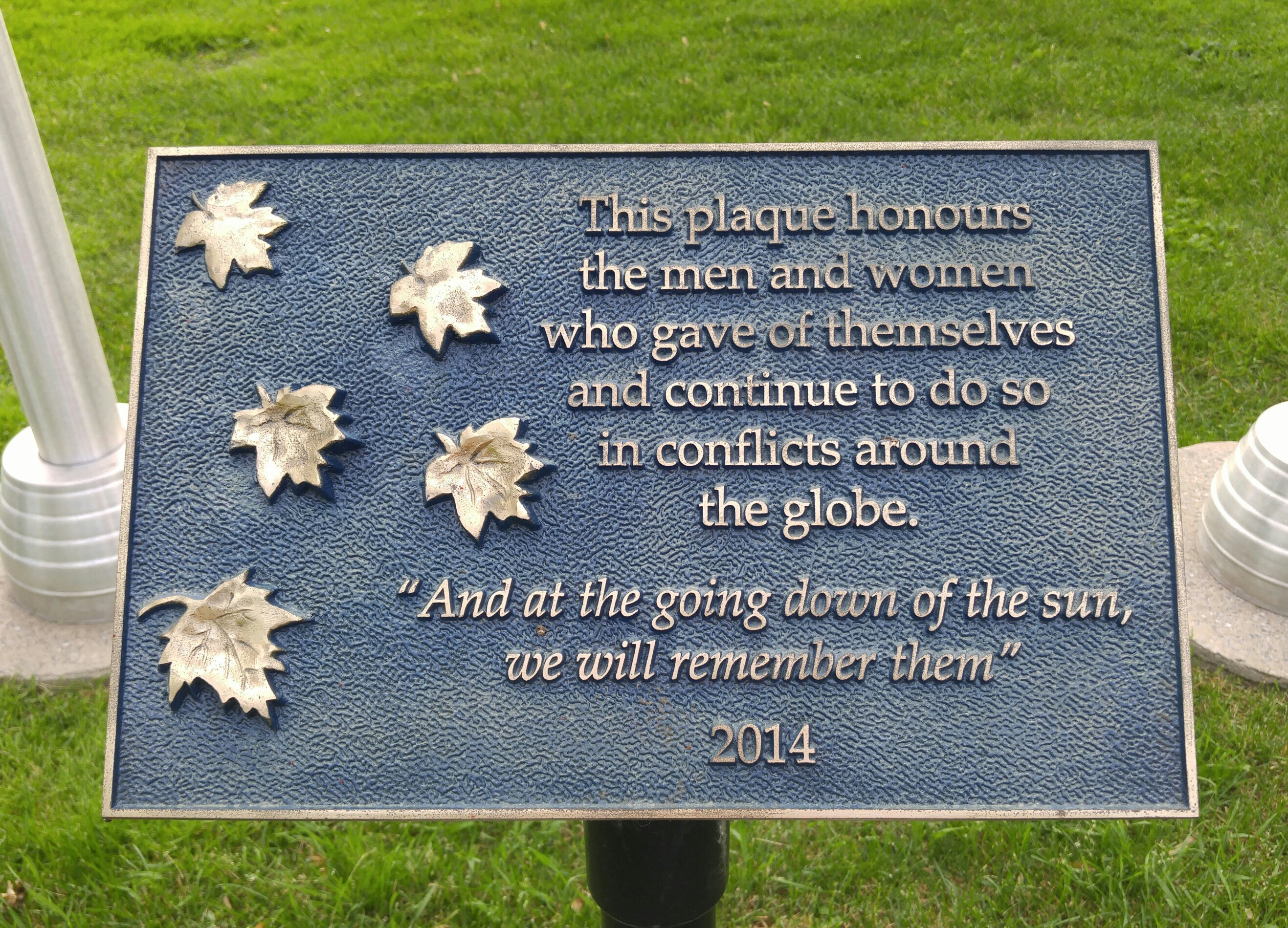 Plaque rendant hommage aux hommes et aux femmes qui ont combattu par le passé ou qui combattront dans l’avenir. Tout près de la plaque inaugurée en 2014, se trouvent deux mâts et des bancs.