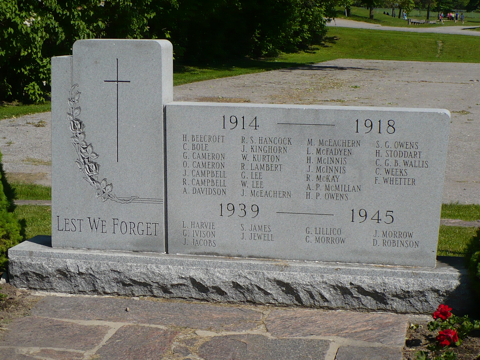 Dédié en novembre 1972 par la filiale no 184 de la Légion royale canadienne, ce mémorial rend hommage à ceux qui sont morts durant les Première et Seconde Guerres mondiales.