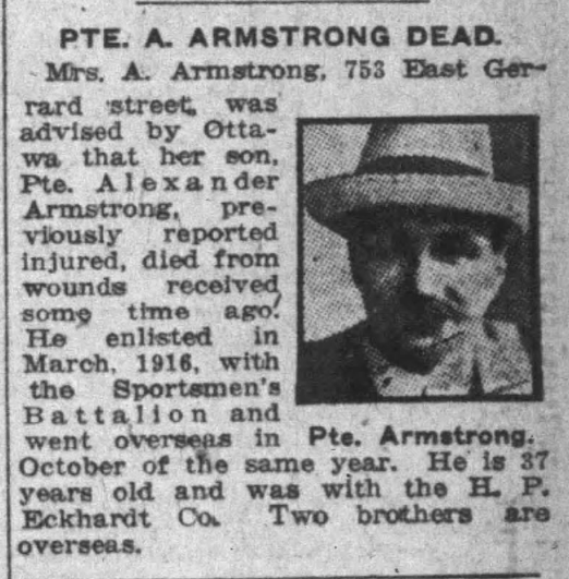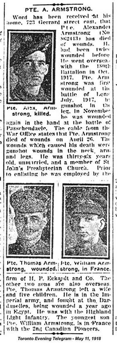 Fils de Annie Armstrong, de 753, rue Gerrard Est, Toronto, et feu Alexander Armstrong. Originaire de l'Écosse.