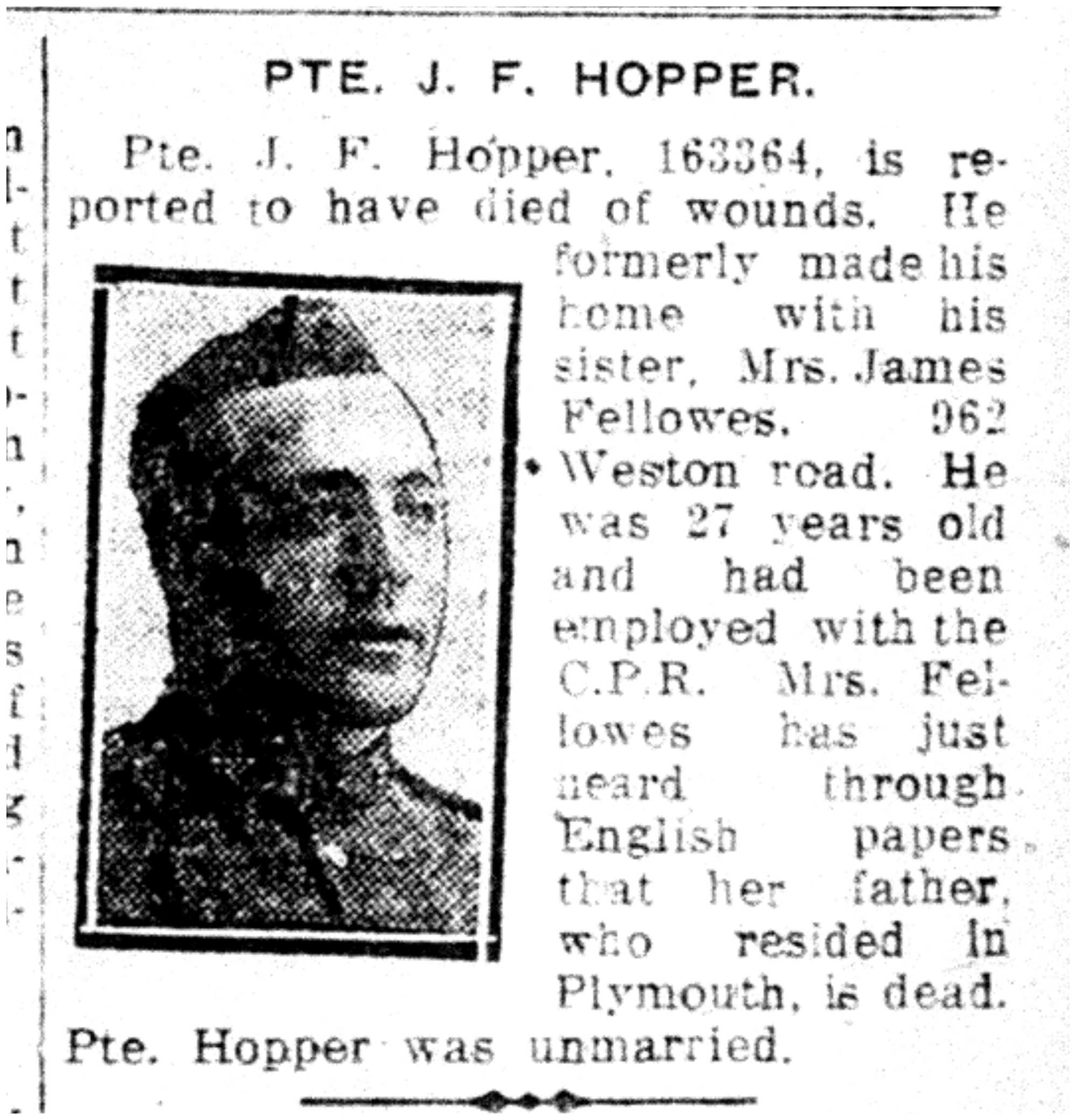 Fils de John et Sarah Hopper, de Plymouth; époux de Georgina Florence Hopper.