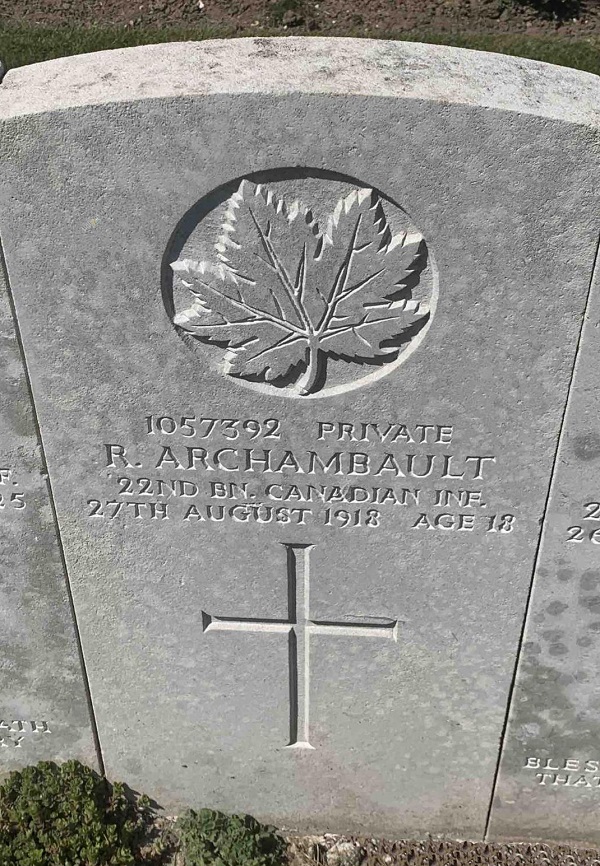 Baptisé Joseph-Isidore-René Archambault. Fils d’Isidore Archambault et Élisabeth Martel, de Montréal, Québec. Il était d’âge mineur et avait déclaré être né en 1898 lors de son enrôlement.