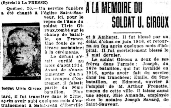 Fils de Pierre-Édouard Giroux (décédé 1902) et Delphine Richard (décédée 1905), de Québec. Il avait déclaré être né le 24 février 1889 lors de son enrôlement et il avait nommé son frère Edmond de Québec comme plus proche parent et héritier légal.