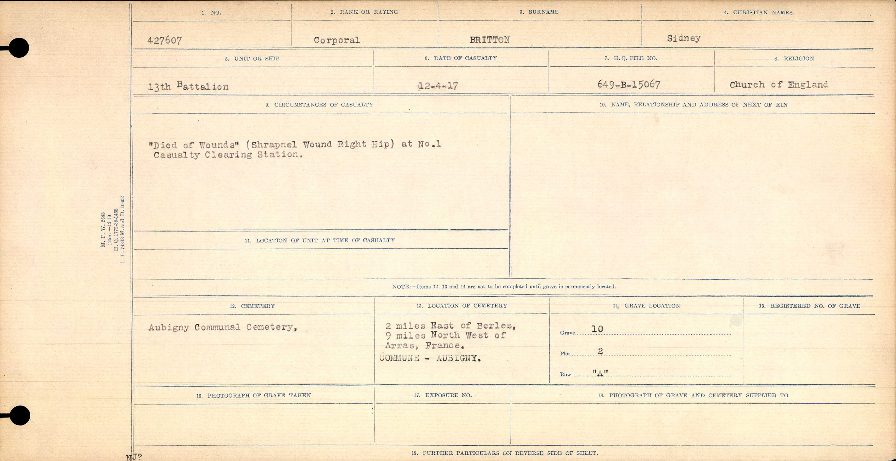 Le cimetière communal d'Aubigny se trouve au sud du village d'Aubigny-en-Artois et l'annexe est derrière le cimetière communal. Aubigny-en-Artois est un village situé à 15 kilomètres environ au nord-ouest d'Arras, sur la route qui mène à Saint-Pol. À partir de la route N39, tournez vers le village sur la route D75. Vous trouverez le cimetière au sud d'une route qui part du centre du village.