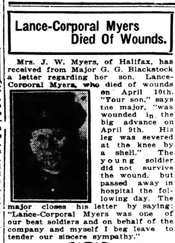 Fils de James W. et Eliza Ann Myers, de Oyster Pond, Jeddore, Halifax, Nouvelle-Écosse.