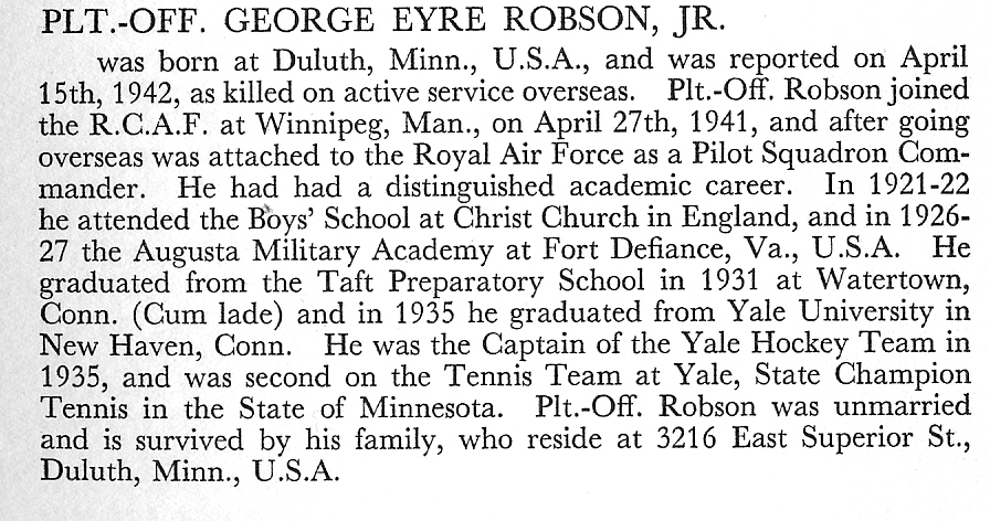 Fils de George Eyre Robson et Maud Platt Robson, de Duluth, Minnesota, U. S.A. B.A. (Yale University, É.-U.).