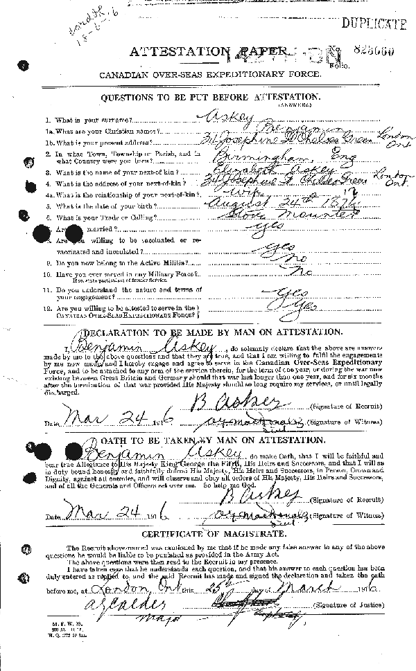 Fils de John et Clara Askey, de Birmingham, Angleterre. Époux d'Elizabeth Askey de London, Ontario.