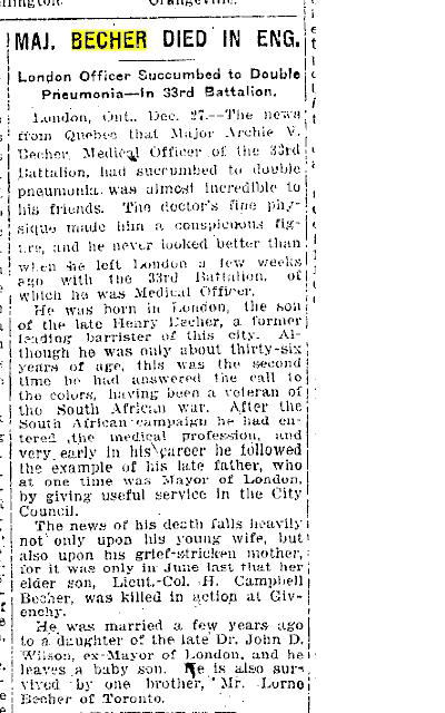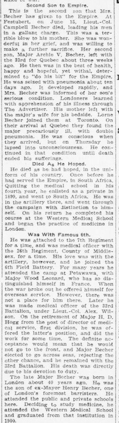 Fils de Katherine Moore et Henry Becher de London, (Ontario). Époux de Flora Adine (née Wilson) Becher et père de John Campbell et Archibald Alexander Cameron, de Thornwood, London, (Ontario). Frère de Lorne et du major Henry Campbell Becher, tué au combat le 15 juin 1915.