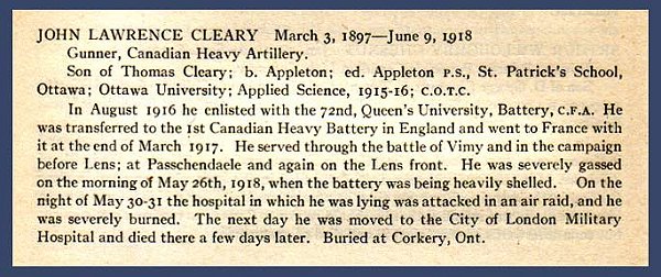 Fils de Thomas C. and Bridget Cleary, d'Ottawa, Ontario. Frère d'Alvina et Margaret Cleary d'Ottawa, Ontario