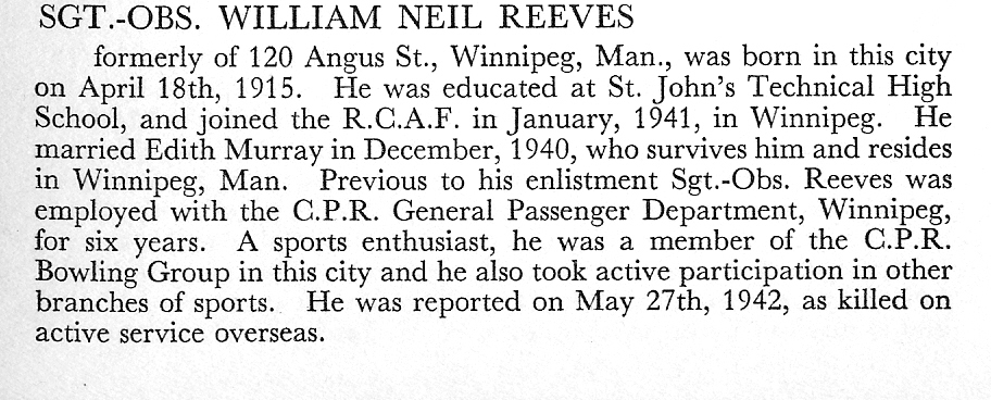 Fils d'Alfred et Ada Reeves de Winnipeg, Manitoba. Époux de Jean Edith Reeves de Winnipeg, Manitoba.