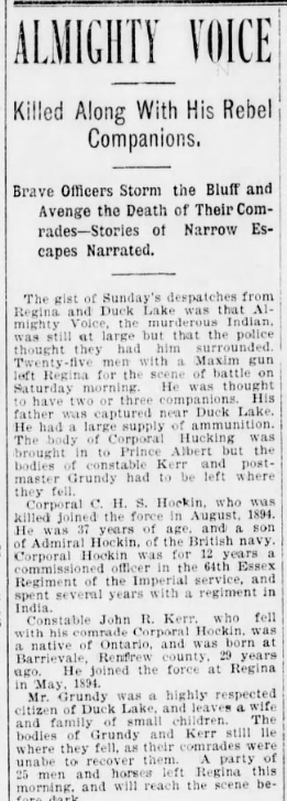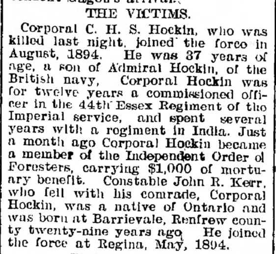 Le caporal Hockin était originaire de l’Angleterre et a été capitaine dans le service impérial (44th Essex Regiment) avant de s’enrôler dans la P.C.N.-O. Il a été promu caporal le 9 avril 1896. Le caporal est tué à Minichinas Hills, près de Duck Lake en Territoires du Nord-Ouest, alors qu’il tentait d’arrêter l’assassin du sergent Colebrook. Une rue de la Division Dépôt est nommée en l’honneur du caporal Hockin.