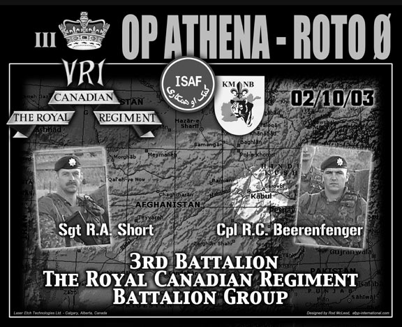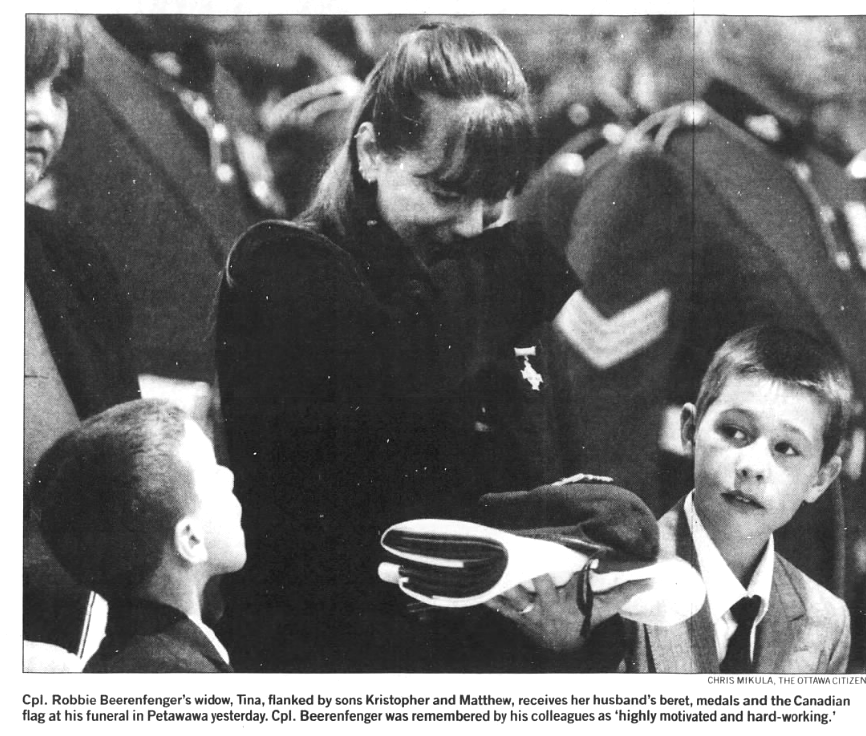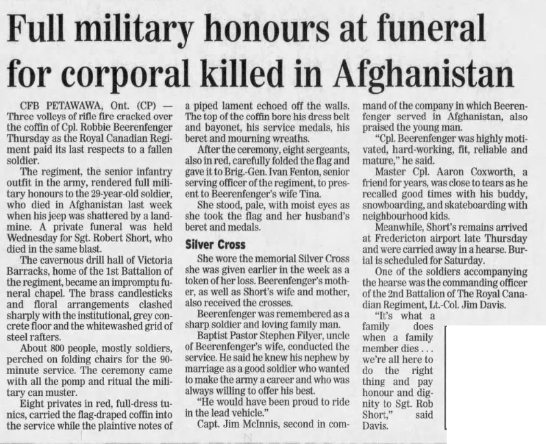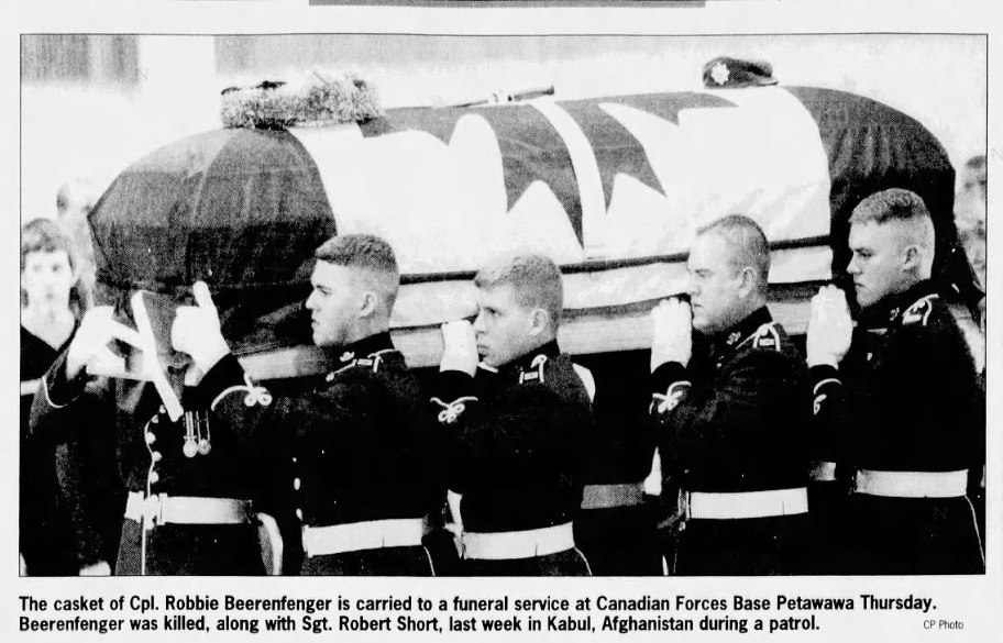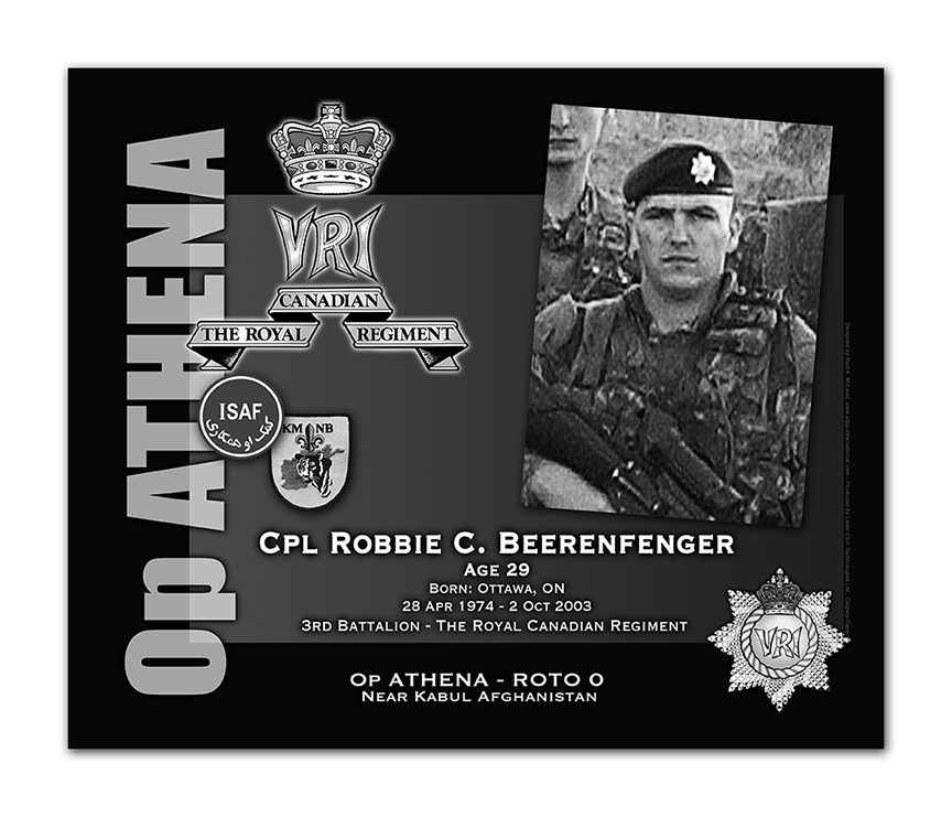Le Caporal Robbie Christopher Beerenfenger, du 3e Bataillon du Royal Canadian Regiment de la BFC Petawawa, a été tué se service près de Kaboul, en Afghanistan, le 2 octobre 2003. Il patrouillait à bord de son jeep Iltis lorsqu’il a roulé sur un engin explosif. Il était âgé de 29 ans.